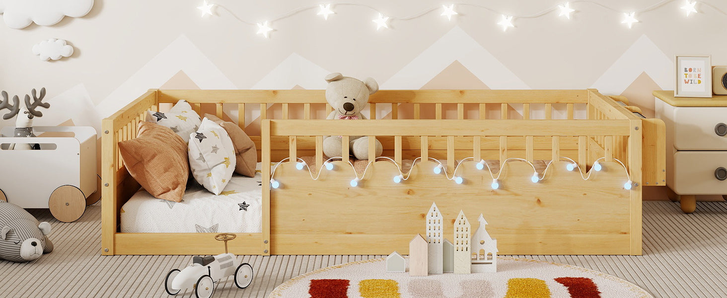 - Enhanced Safety-The twin floor bed with solid wood baffle design to prevent children's hands and feet to clamp the risk of toys and various items falling risk. With 2.7 inch gap in each fence effectively preventing pinch hazard. Made of solid pine wood + MDF, this bed features a sturdy high quality solid wood construction for durability.