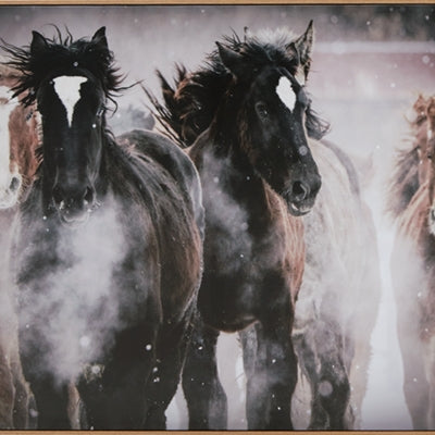 Framed gallery wrapped canvasD-ring bracketHorizontal hanging only Horses in brown, black and white Framed gallery wrapped canvas D-ring bracket for hanging Horizontal hanging only