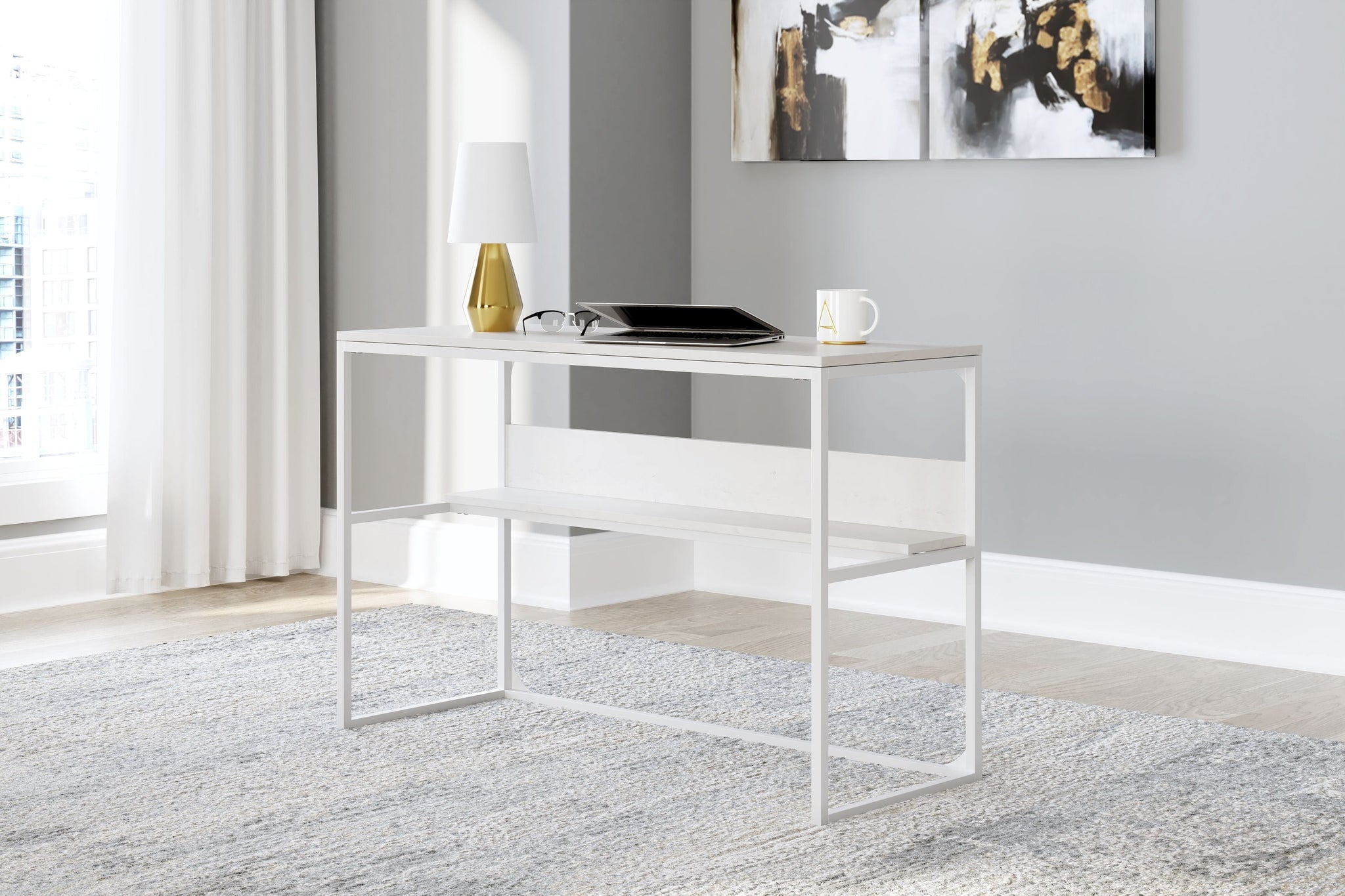 Bring your vision of a modern home workspace to life with this sleekly designed home office desk. Its linear construction and white finish keep things minimal. A small shelf along the back rounds out the versatile, striking desk.