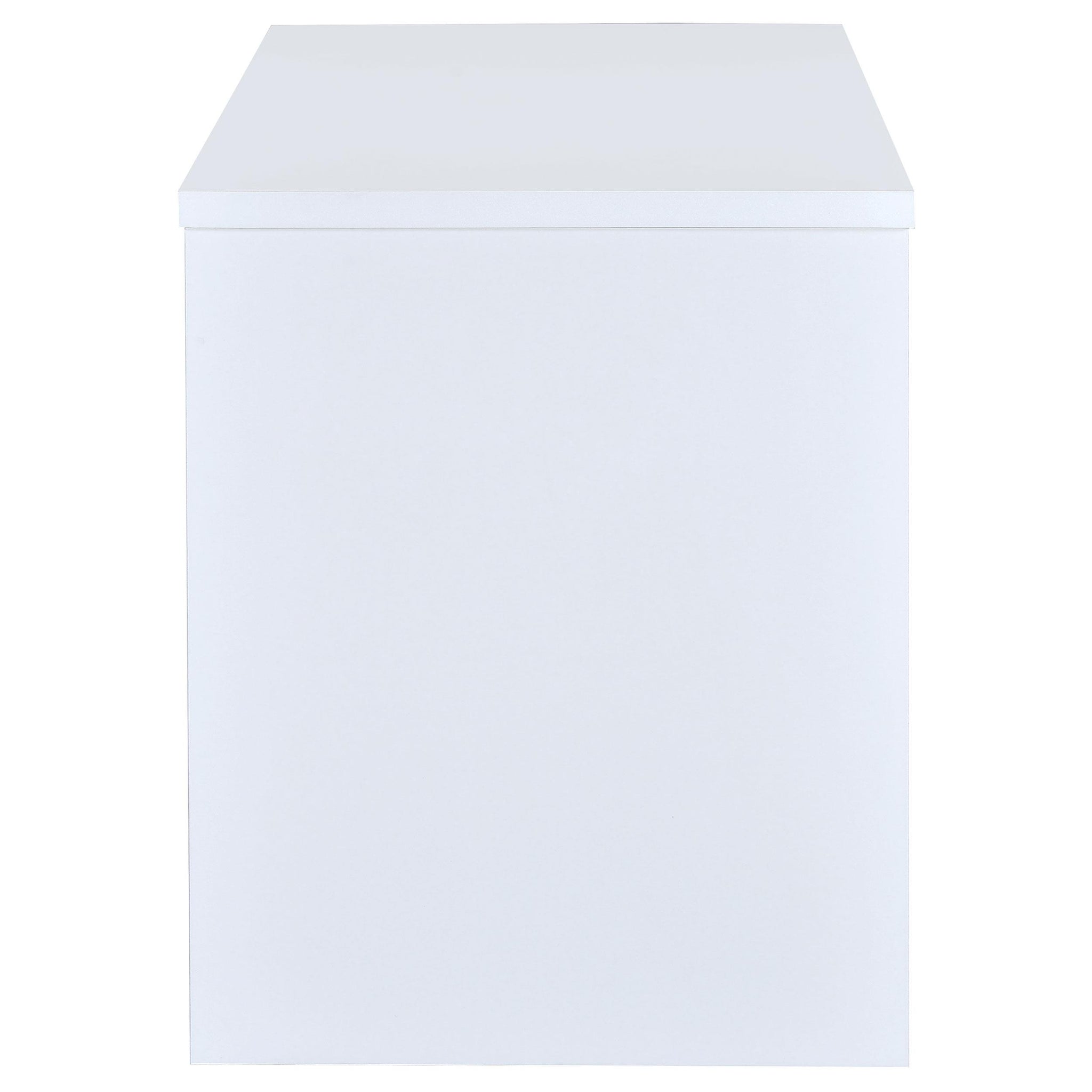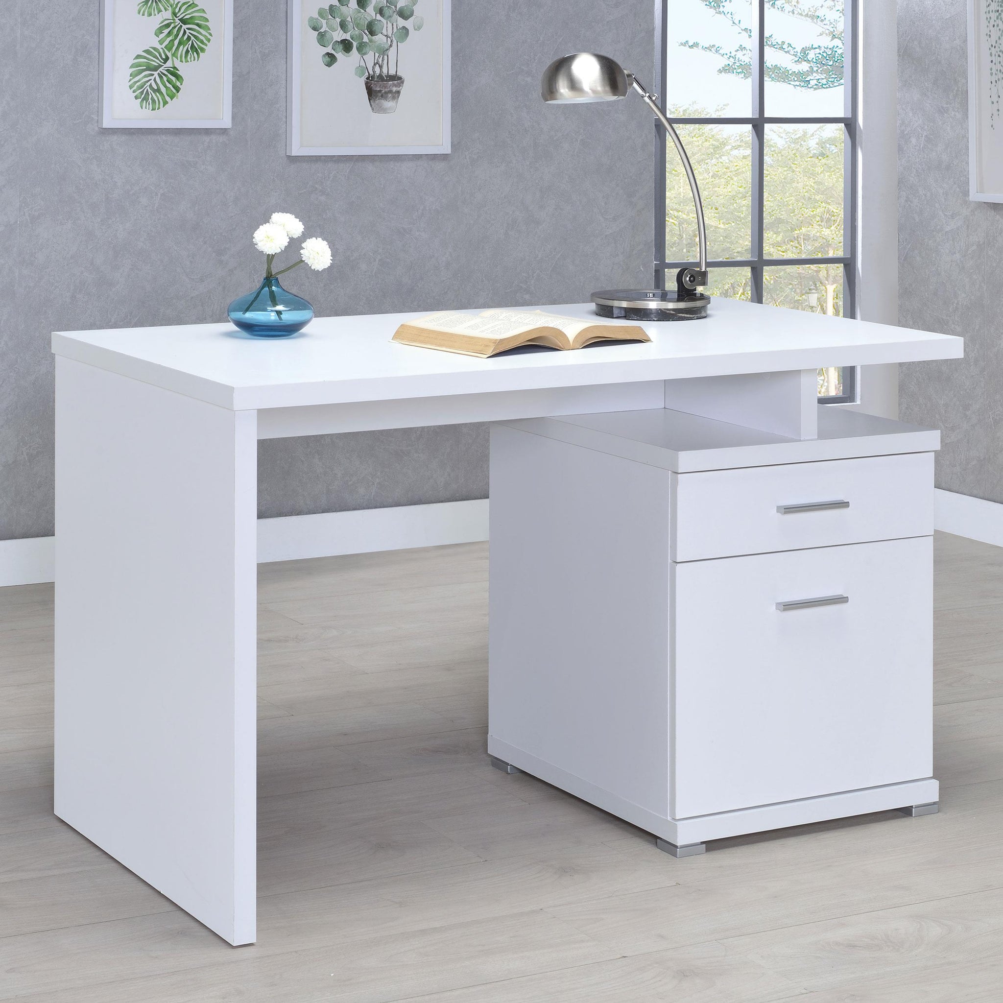 A fresh, energetic ambiance creates design versatility in a compact space. Ideal for a small office or a childs room, this office desk is built to impress. With a bright white finish, it delivers an enticing and invigorating flavor. Enjoy the flexibility of a reversible setup that positions its drawer and file cabinet unit on the left or right side. This modular-style office desk provides a spacious writing surface, a storage drawer, and a file cabinet that accommodates both legal and letter size documents.