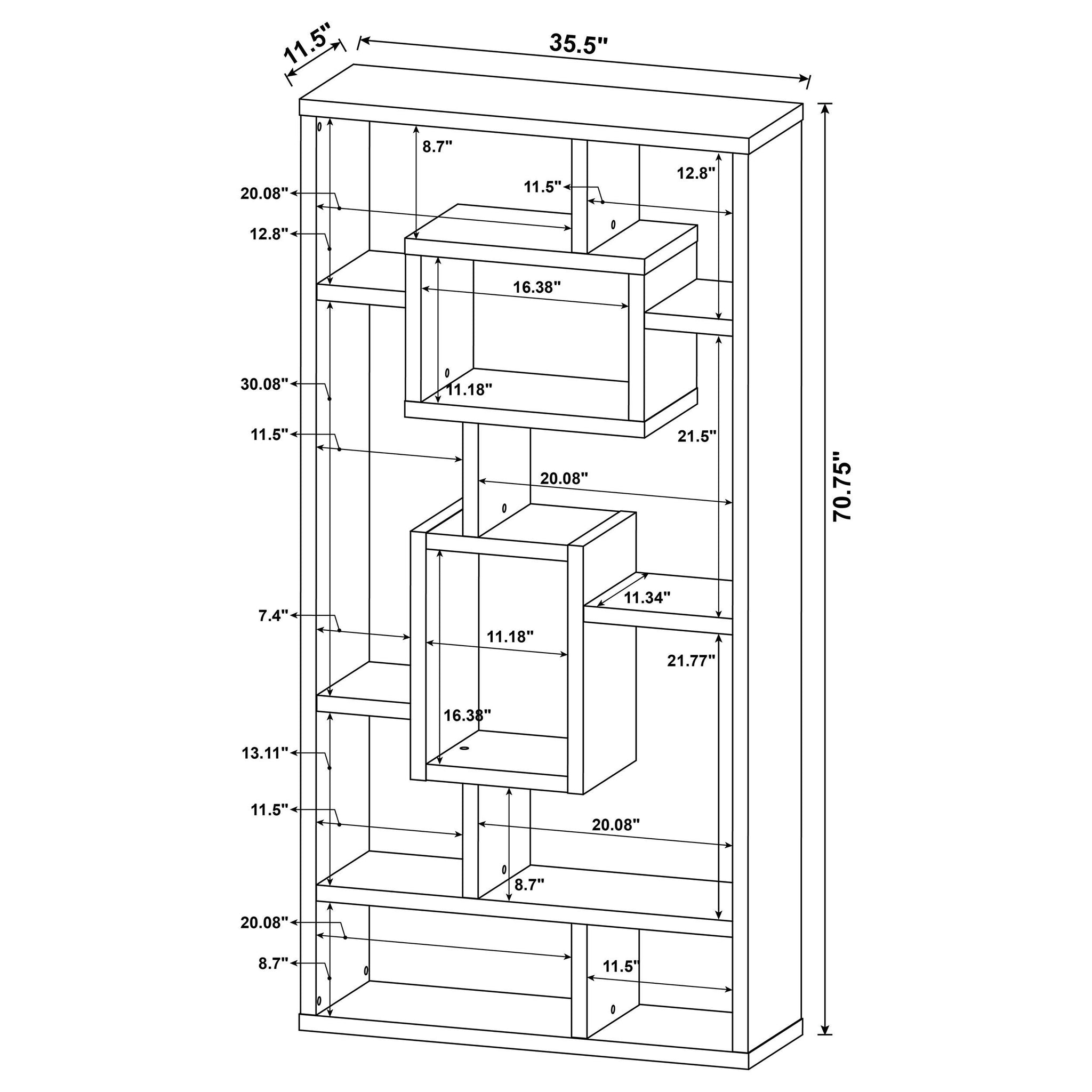 Elevate a den or home office with clean lines and a contemporary design. The sharp, stylish silhouette of this bookcase exudes artistic appeal. With ten shelves of varying shapes and sizes, its the perfect combination of fashion and functionality. Constructed from steel, particle board, and engineered veneer, its a sturdy and durable option. Perfect as a decorative display or simple storage, this shelf upgrades a room with chic, classy convenience.