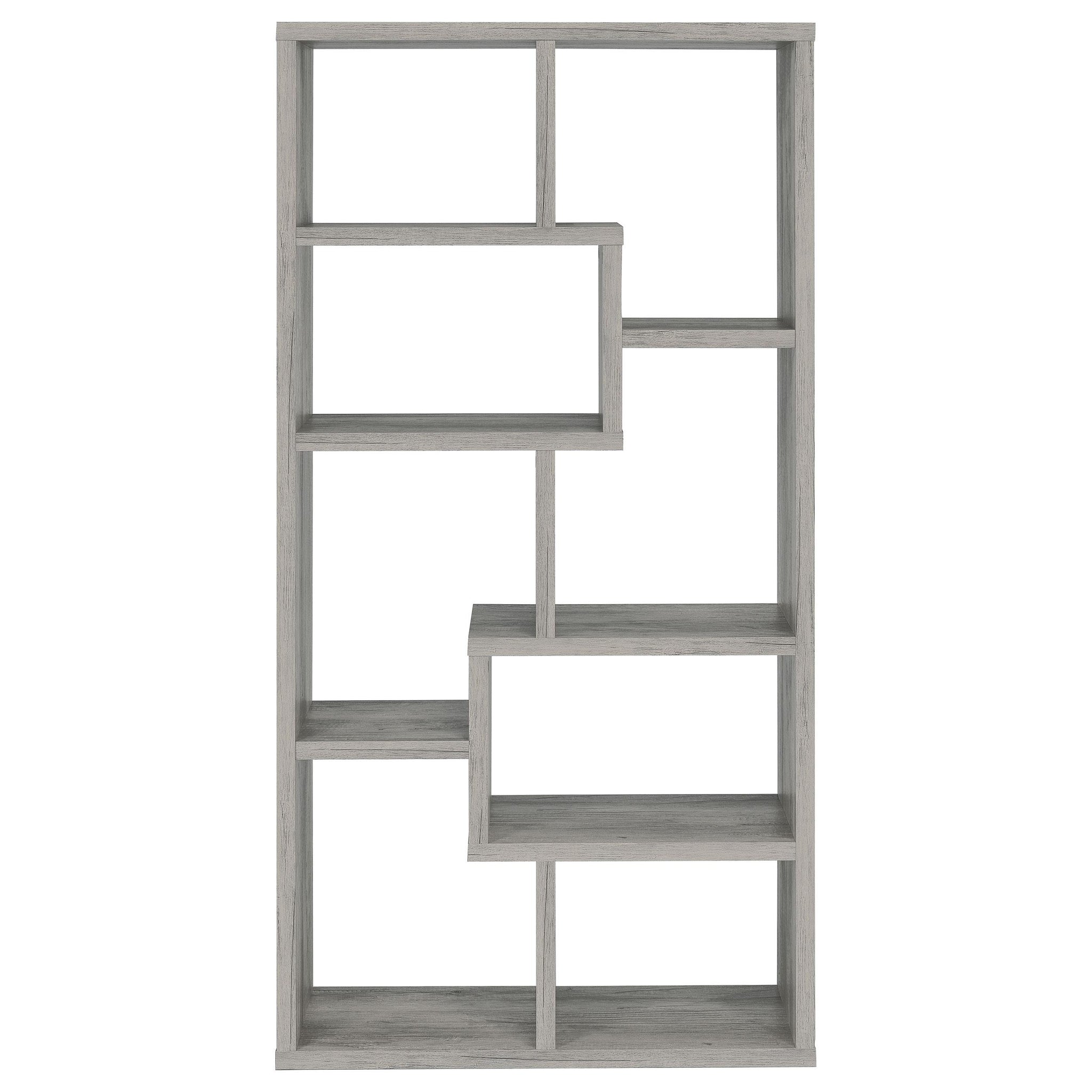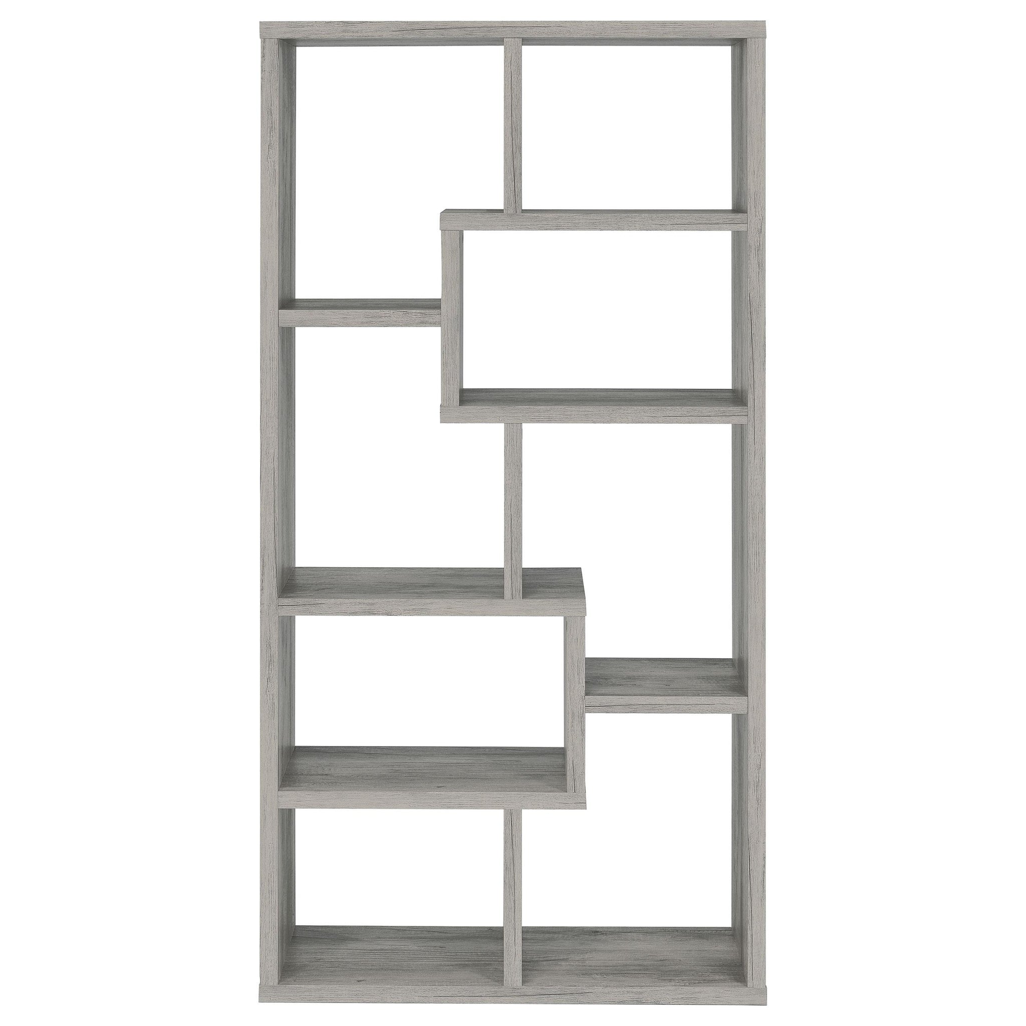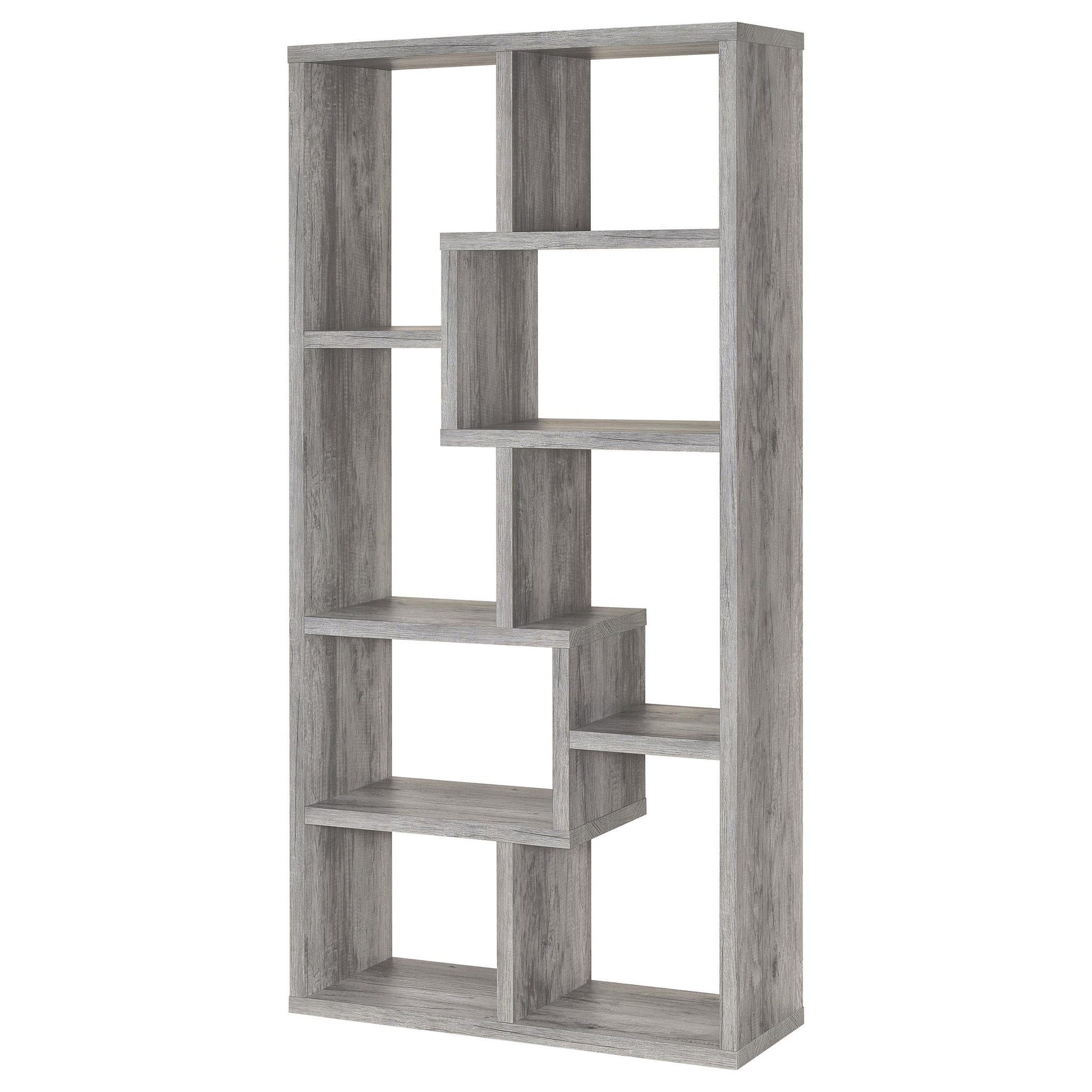 Tall and spacious, this bookcase sends a positive message. Enjoy a modern configuration with traditional appeal. Puzzle-like construction blends various widths and heights in eight compartments. Perfect for compact areas, its height frees up horizontal space. Make use of room to display and organize books, photos, and decor objects.