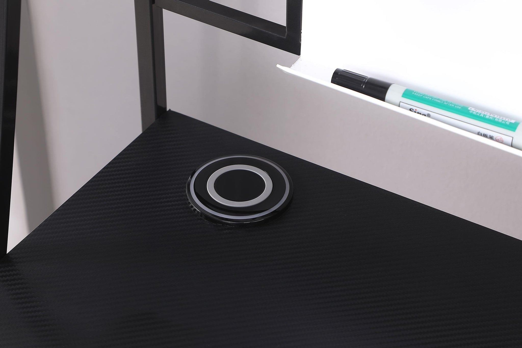 Slender mid-century-inspired metal tube legs angle outward, adding expression to the minimal, water and stain-resistant black finish of this modern writing desk. Complete with a black finished workspace and gunmetal finished accents, this writing desk lends itself to many color palettes while offering ultimate functionality in the space. Modern touches like two built-in USB ports, an AC outlet, and a wireless charger allow you to stay connected. Above the desk is a whiteboard setup, cup and water bottle holders, and extra hooks for organizing all your essentials. Compact, yet stylish, this modern-inspired writing desk also offers extra open shelves for storing books and files.