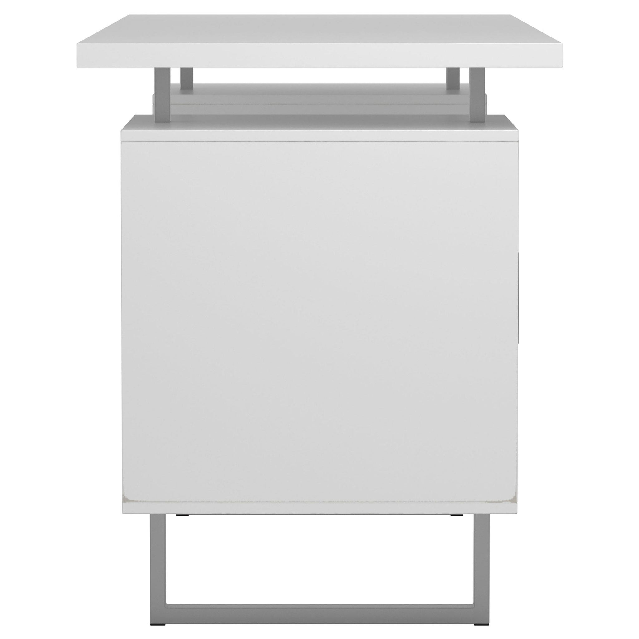 Chic and modern, this wooden writing desk creates a gorgeous focal point in any home office. Sleek lines of silver finished metal create a sturdy foundation for its stylish design. A rectangular, floating tabletop adds visual intrigue to its clean silhouette. A storage cabinet, drawer, and file cabinet keep office essentials organized with ease. Available in your choice of attractive colors, theres an elegant option to effortlessly match with your space.