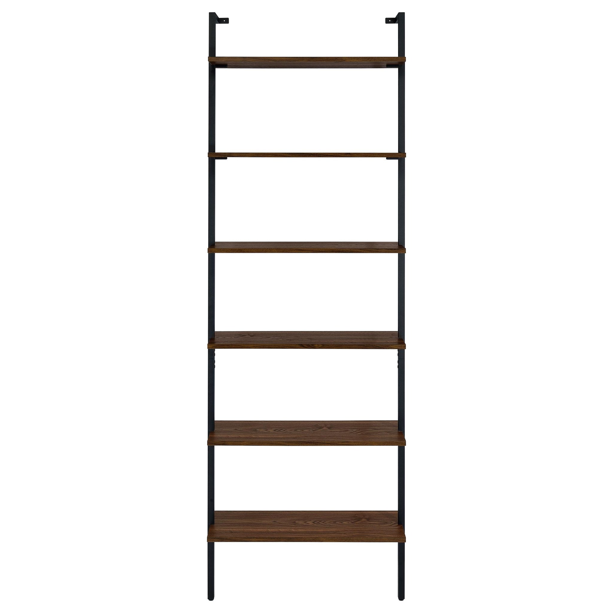 Curate your space to achieve a refined look and feel with this modern wall bookcase. Its elegant simplicity of silhouette brings light, airy ambiance in any space, maximizing space utilization without overwhelming. It features six open shelves in a walnut finish, each set within a black finish metal frame. The clean, chic lines of the frame attach to the wall at the top and drop to the floor, creating stability and minimalist appeal. Add a pair flanking your television for storage, or create a decorative vignette in a living or dining room.