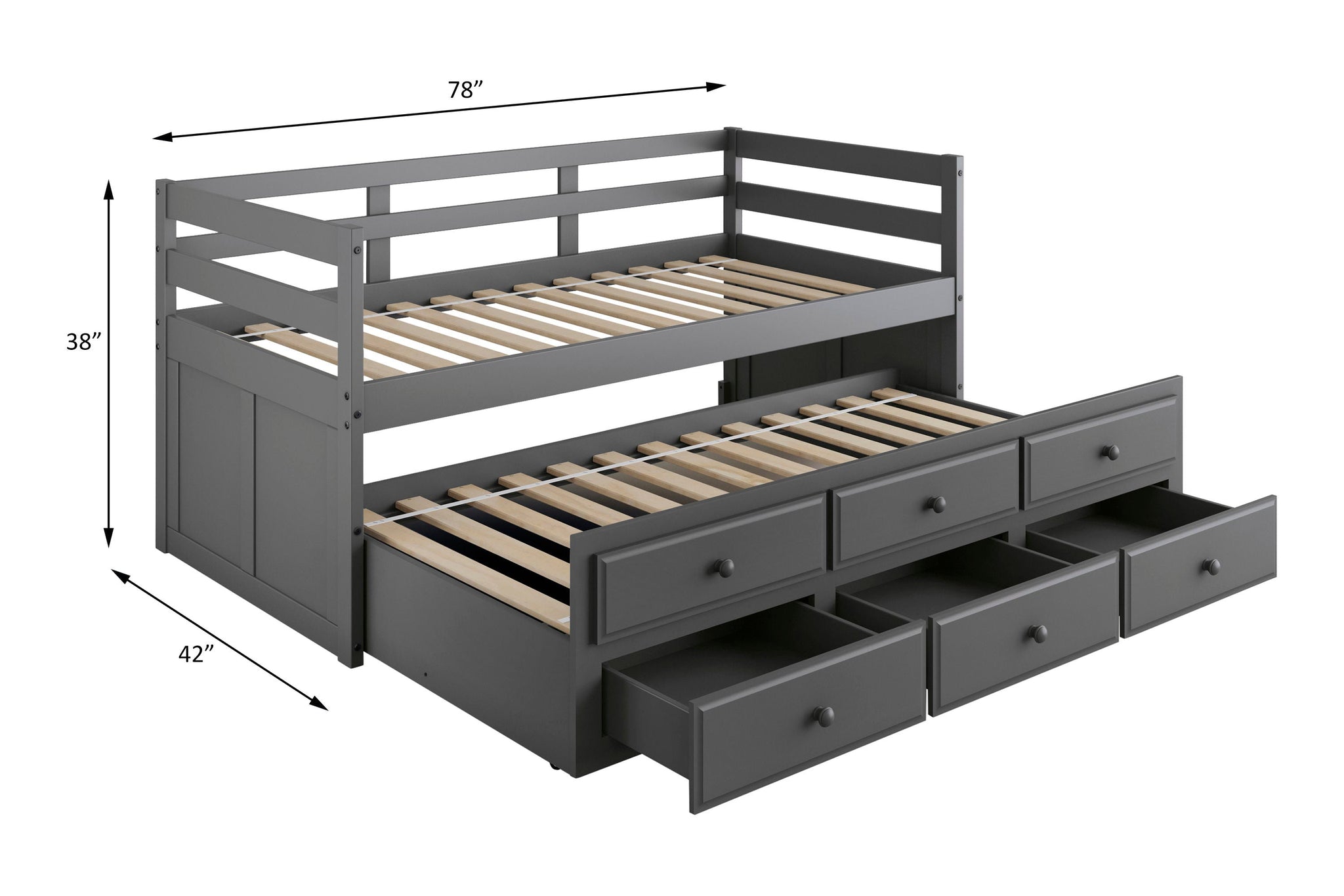 Ordered, stylish, and free of clutter. This versatile bed creates the ultimate dreamy bedroom for both children and adults. A second single bed is cleverly hidden underneath the stylishly crafted wood frame. Three fully-functional drawers at the bottom keep personal stuff within easy reach of children. Muted grey finish softens the whole bed, and perfectly complements your cozy bedding to make sure all things are relaxing and comfortable.