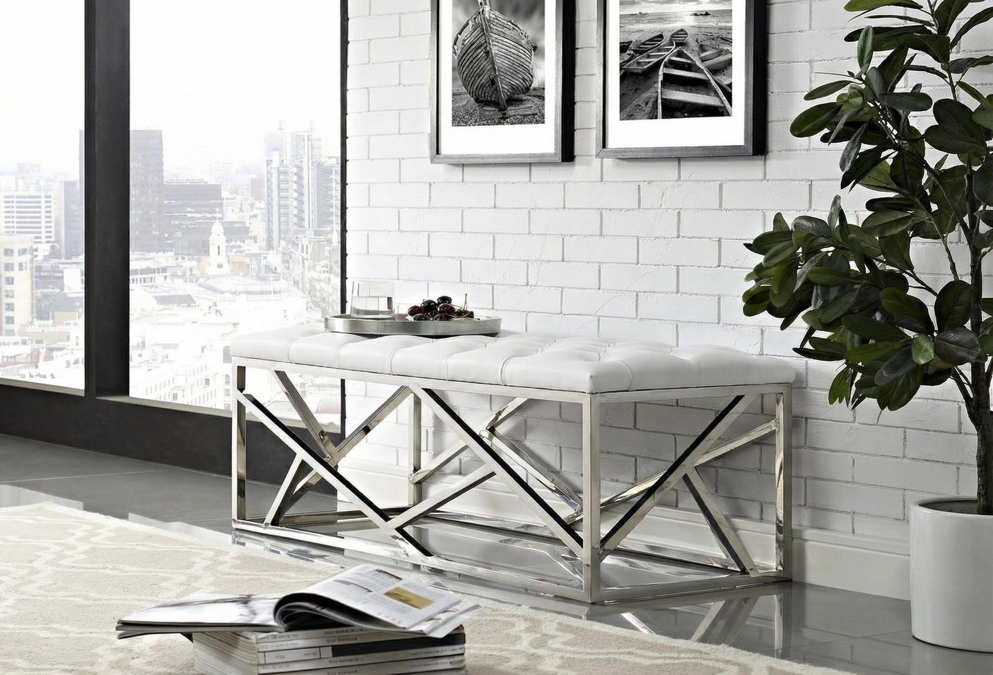 Offering a luxurious feel is the Modrest Lindsey Modern White Leatherette & Stainless Steel Bench. The white leatherette upholstery with tufted top provides its opulent feel and look. The stainless steel base featuring angled supports to fortify its stance. Aside from offering a seat, this modern bench is likewise a superb accent in your living space.