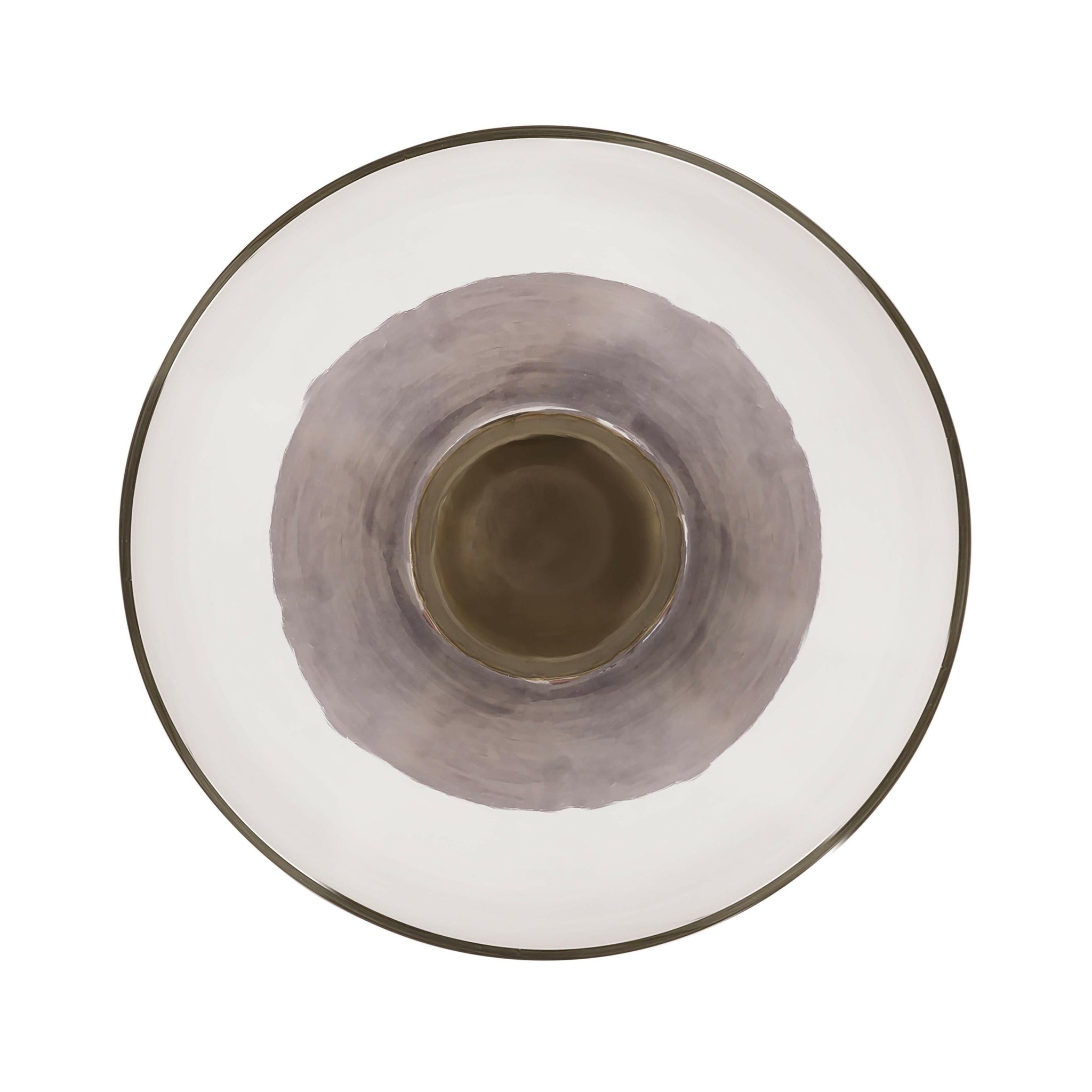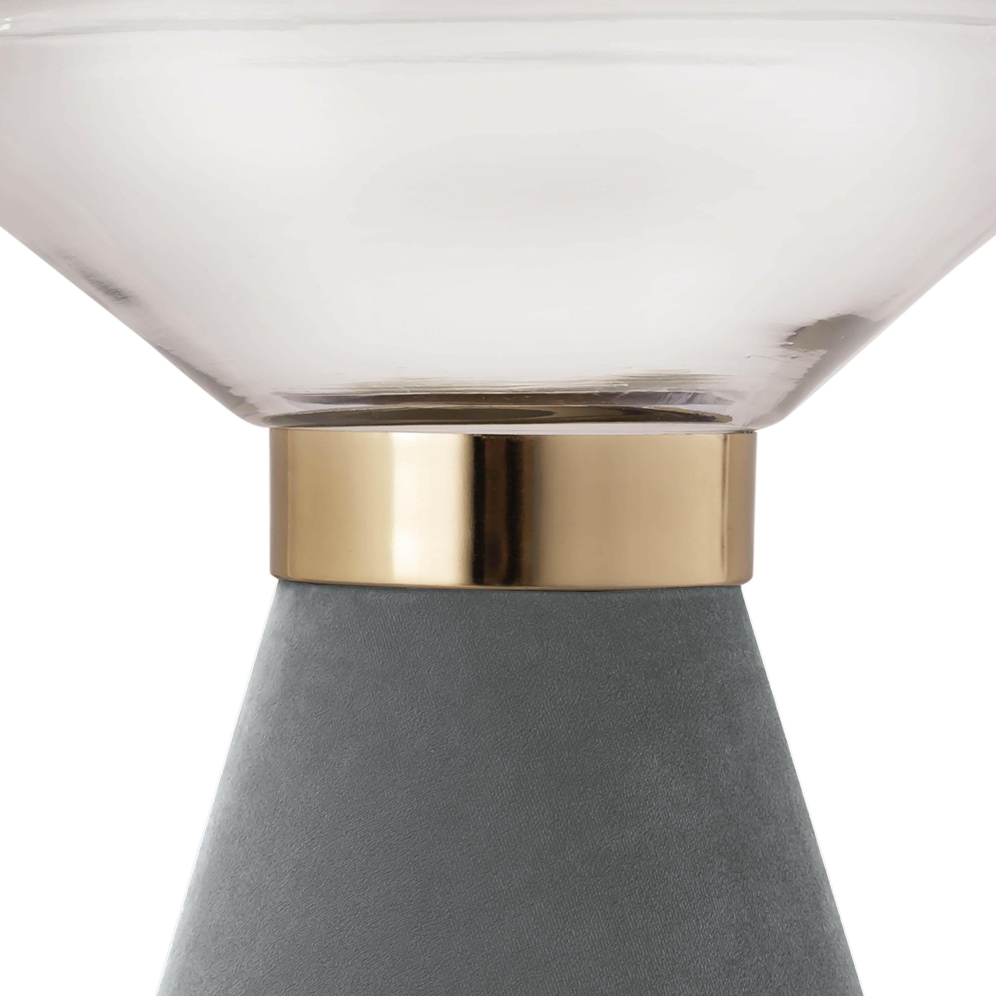 Enhance your space with the modern and stylish Aurora side table. Featuring a transparent cloud-hued glass top perched upon a grey velvet upholstered conical base and complemented with gold accents, this table will be an instant eye-catcher in any room.