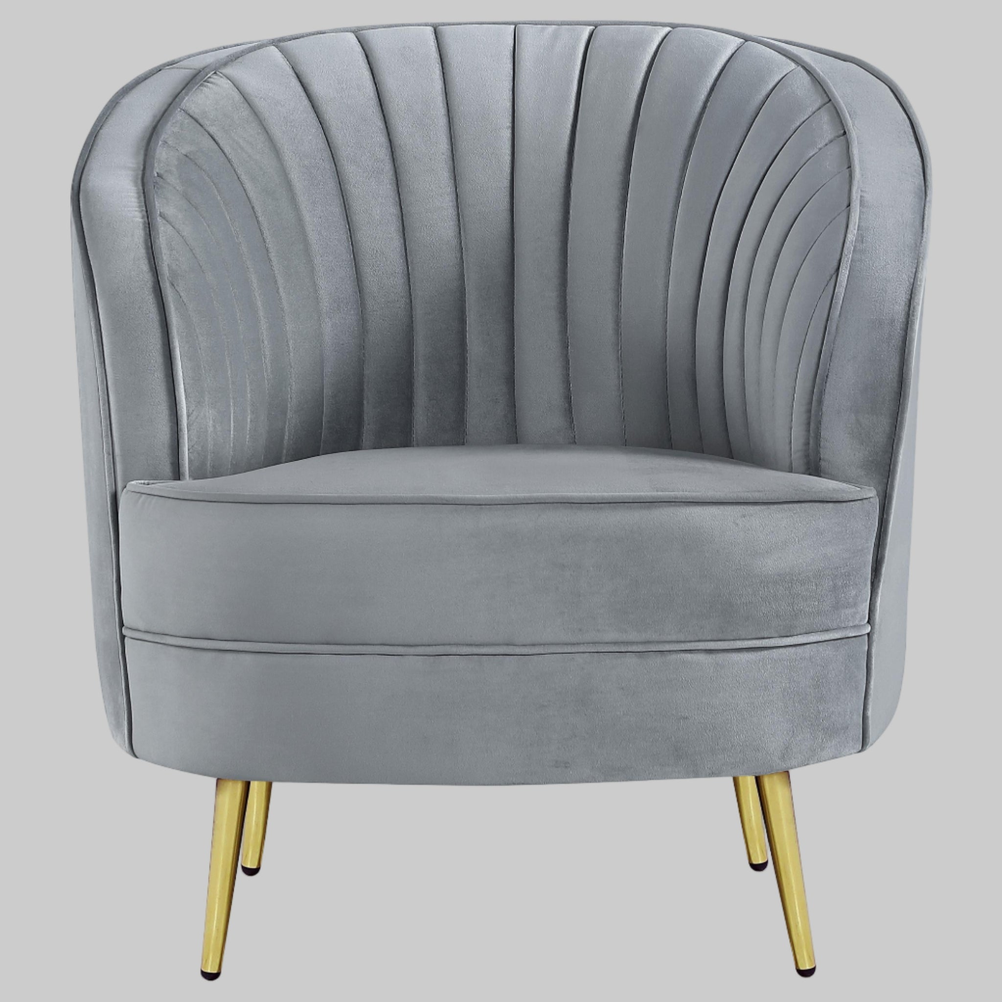 Add a touch of retro-inspired glamour to your space with this elegant accent chair in soft grey velvet. The curved barrel design and channeled backrest create a stylish focal point, while plush cushioning and gold tapered legs provide comfort and modern sophistication. A perfect blend of mid-century charm and contemporary flair.
