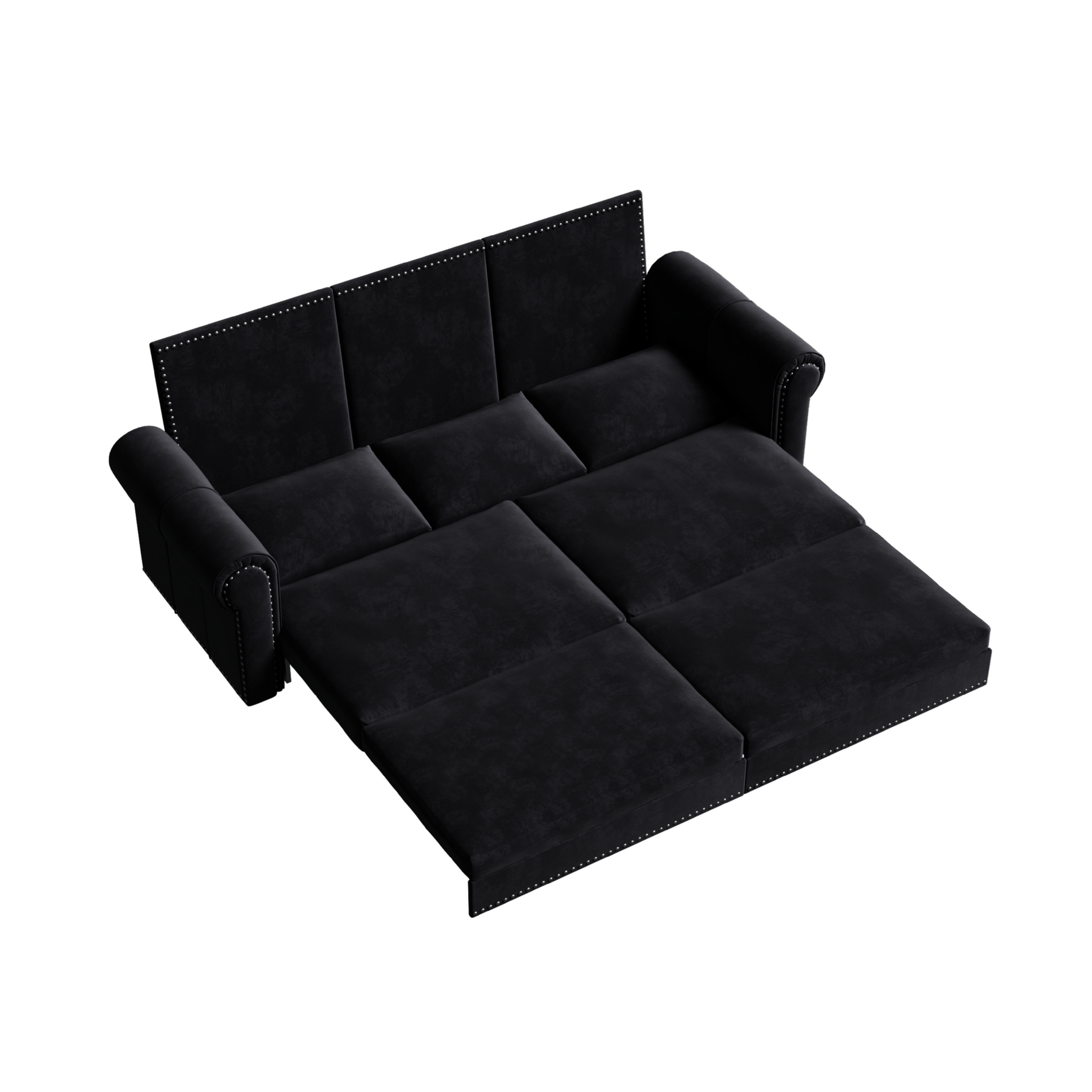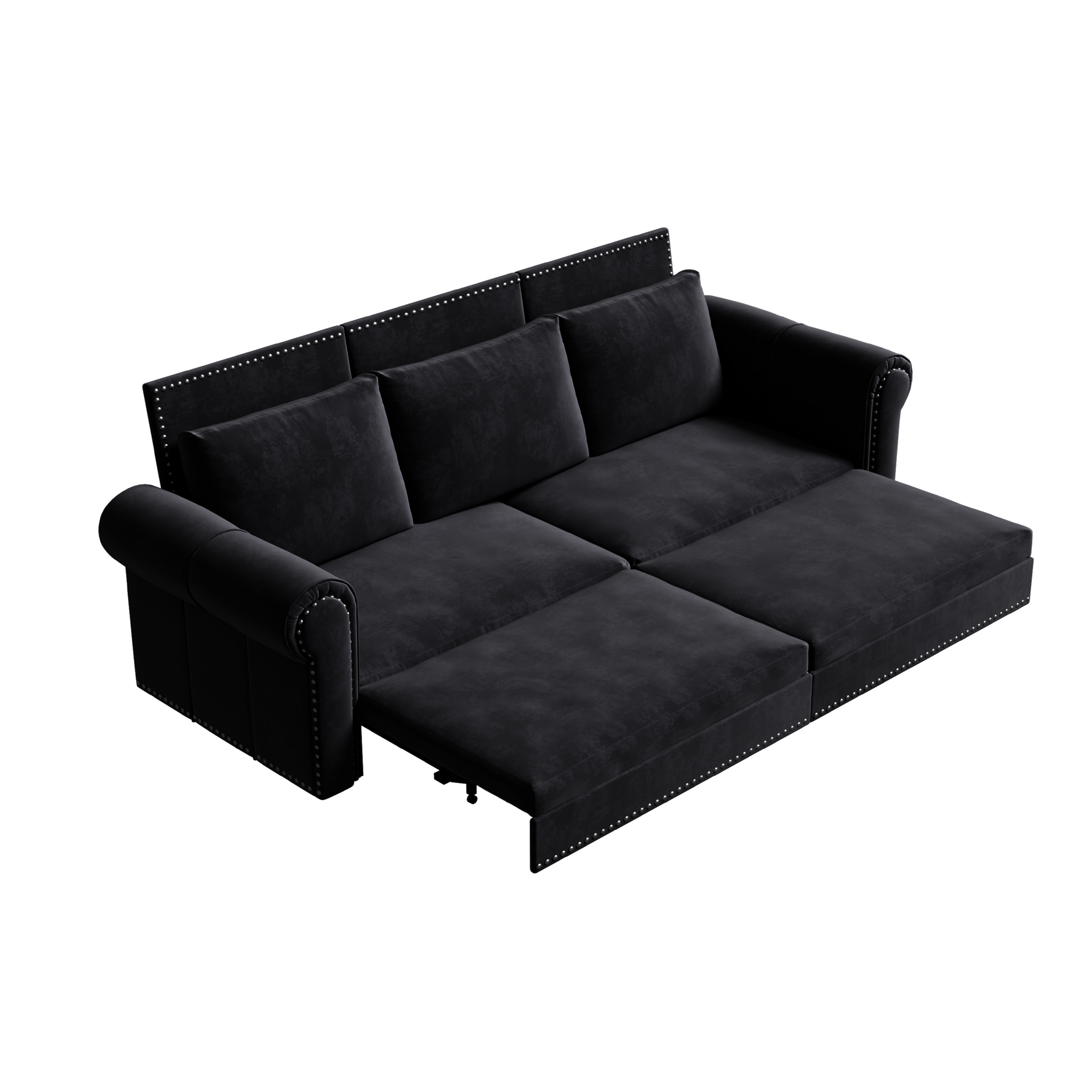 This elegant and practical sofa bed easily meets the needs of various living scenarios through innovative three-level design (sofa lounge chair king size bed). Simply pull out the hidden bed frame under the seat (supporting two length adjustments), and you can switch to a comfortable lounge chair or unfold it onto a spacious bed. The sofa is made of luxurious velvet fabric and wrapped in high-density rebound sponge, with a delicate and skin friendly touch. It complements the retro rivet decoration and classic rolled edge armrest, perfectly interpreting the light luxury retro aesthetics. Internally, a reinforced steel pipe frame and anti slip support legs are used to create a stable base, ensuring load-bearing safety and long-term durability. Suitable for various spaces such as living rooms, study rooms, guest rooms, etc., the 10 minute quick assembly design makes it more convenient to use. Whether as daily sitting and sleeping furniture or a temporary guest room bed, this sofa bed that combines aesthetics, comfort, and practicality can add a touch of retro and elegant fashion to the home.