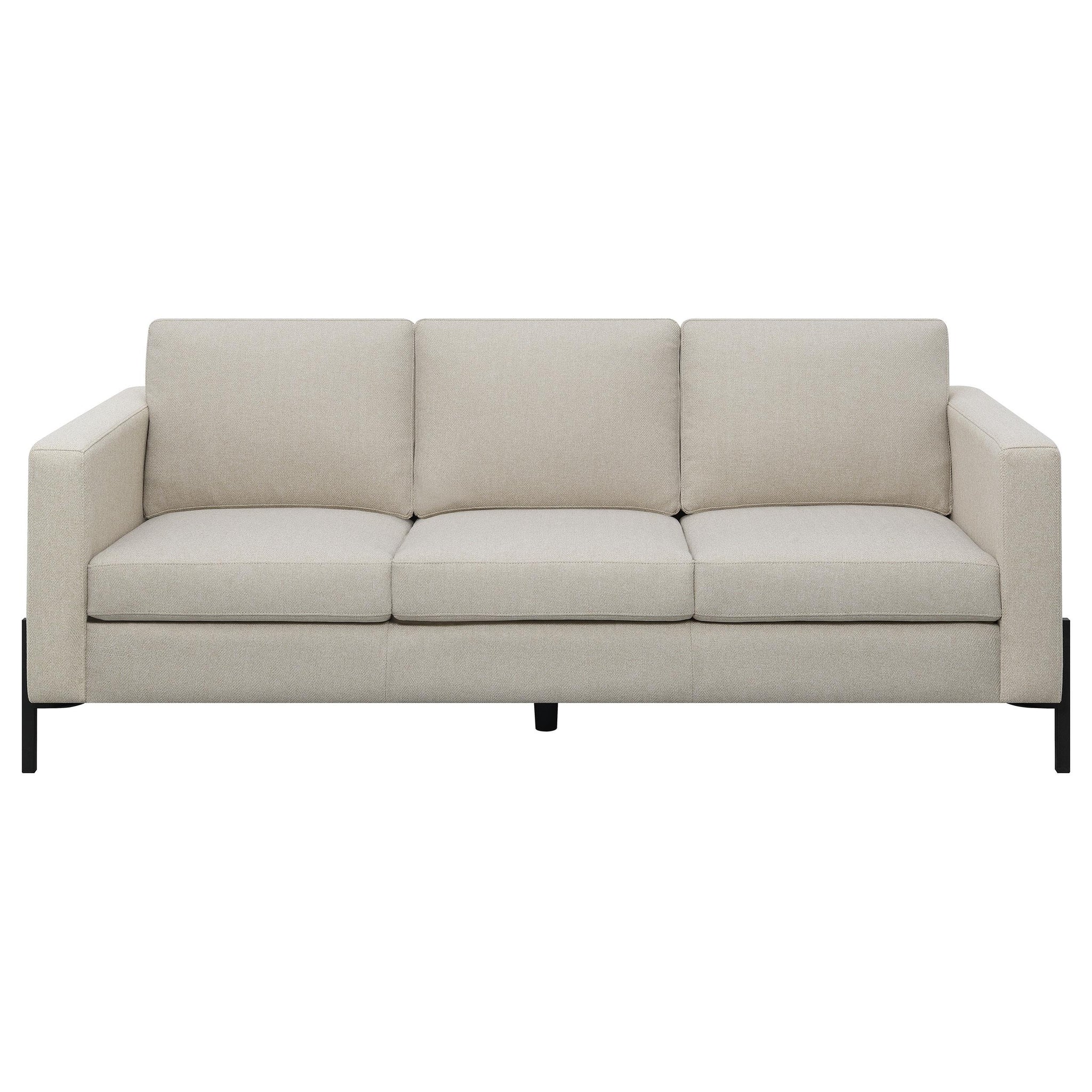 Introducing our impeccably designed modern sofa, where sophistication meets comfort. With its clean lines and impeccable tailoring, this sofa exudes elegance. The subtle textured herringbone fabric offers a refined touch, setting it apart in the realm of contemporary furniture. Prioritizing your comfort, the attached seats are constructed with pocket coils, ensuring both support and durability. The sofas allure is further accentuated by its unique elevated metal leg base, finished in a sleek black. This piece is not merely a sofa; its a statement of style and luxury, ready to elevate any living space.