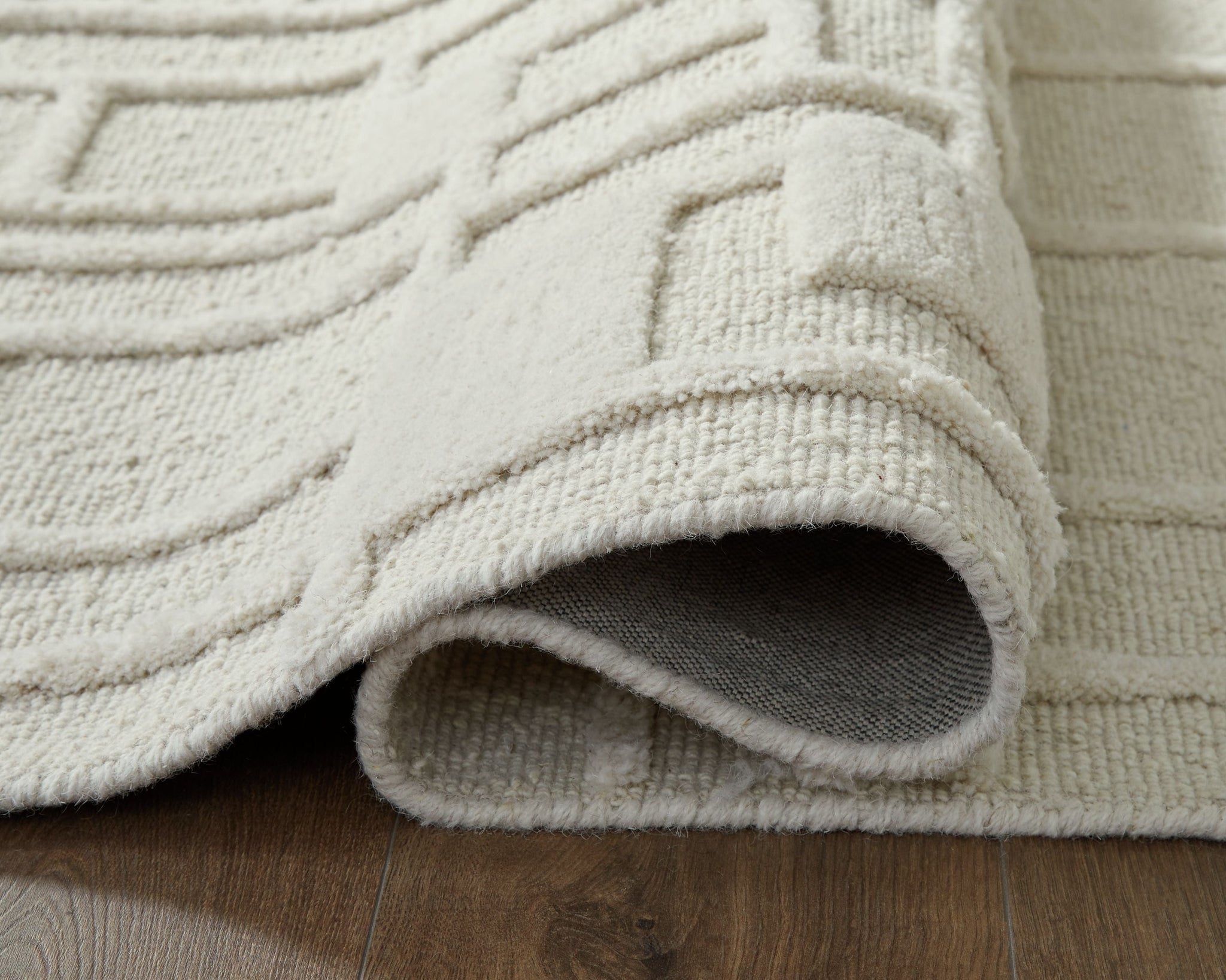 Designed for a more laid-back sense of style, this Area Rug, serves up a subtly striking geometric motif. Hand woven and tufted in a high-low pile teeming with depth and dimension, its understated neutral palette gives it versatility for a natural blend with your decor.