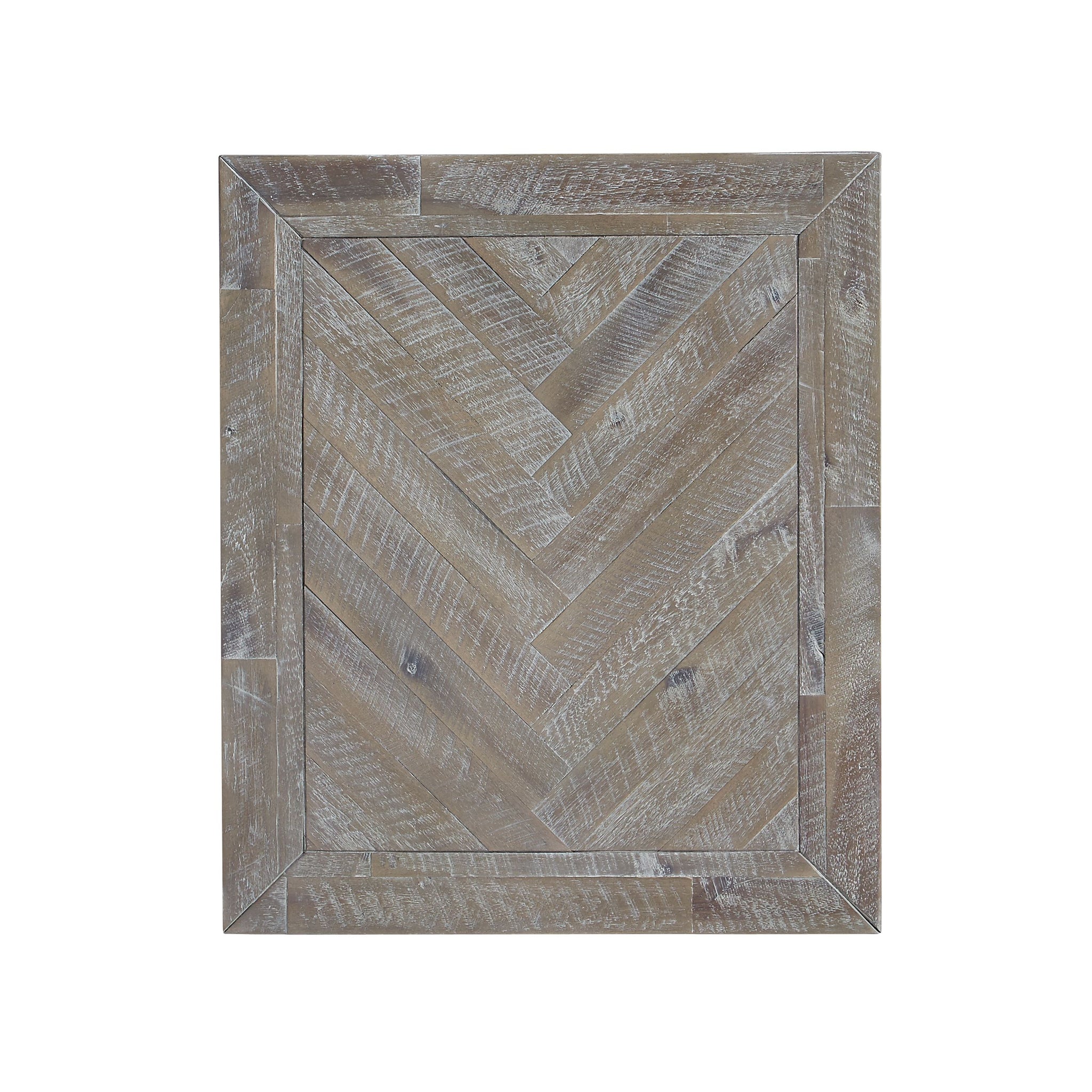 Rustic and contemporary. The Herringbone collection's appeal comes from the roughhewn Acacia used in its creation. Hand-selected planks of solid wood are carefully sanded, stained and whitewashed for a driftwood appeal that accentuates the active grain and draws out natural knots and markings from the milling process. They are then inlaid over plywood to create a handsome herringbone pattern.