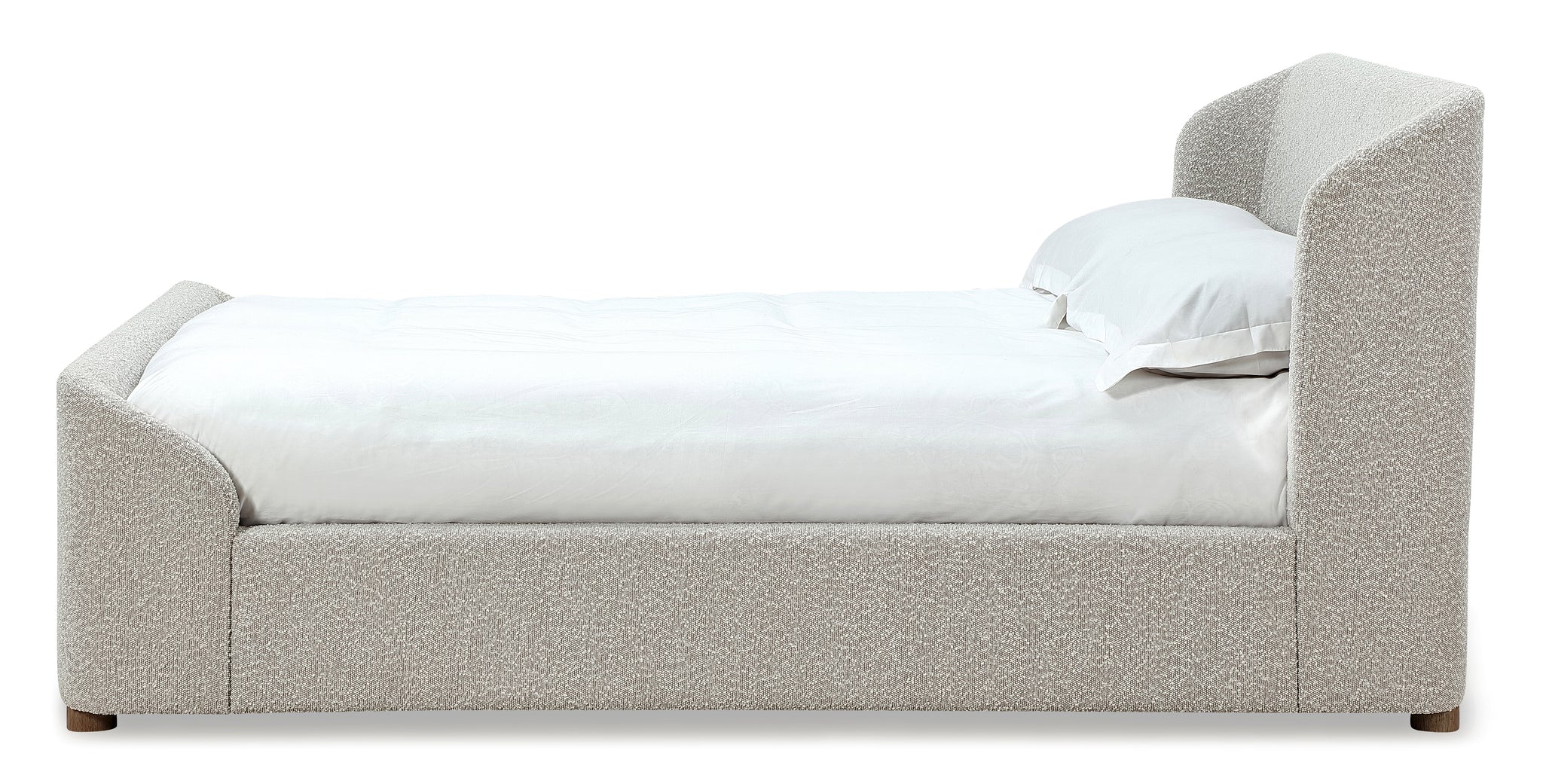 Curvy and Cozy, the Kiki bed features a low, tightly wrapped headboard and footboard that creates a comfortable, enveloping feel. The tactile boucle fabric is a soft gray color, made from 96% polyester and 4% acrylic for easy care and cleaning. Includes a European-style bentwood mattress support with metal center rails and support legs for use without a box spring. The matching storage bench features a no-slam safety hinge, adding storage and seating at the end of the bed or elsewhere in the home.