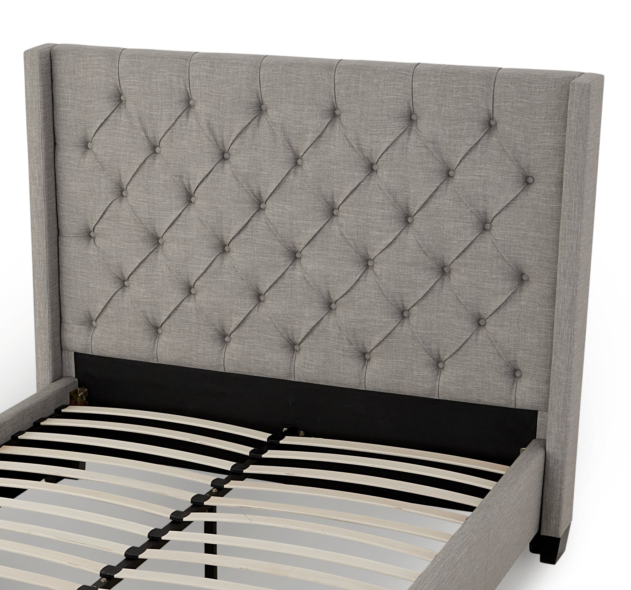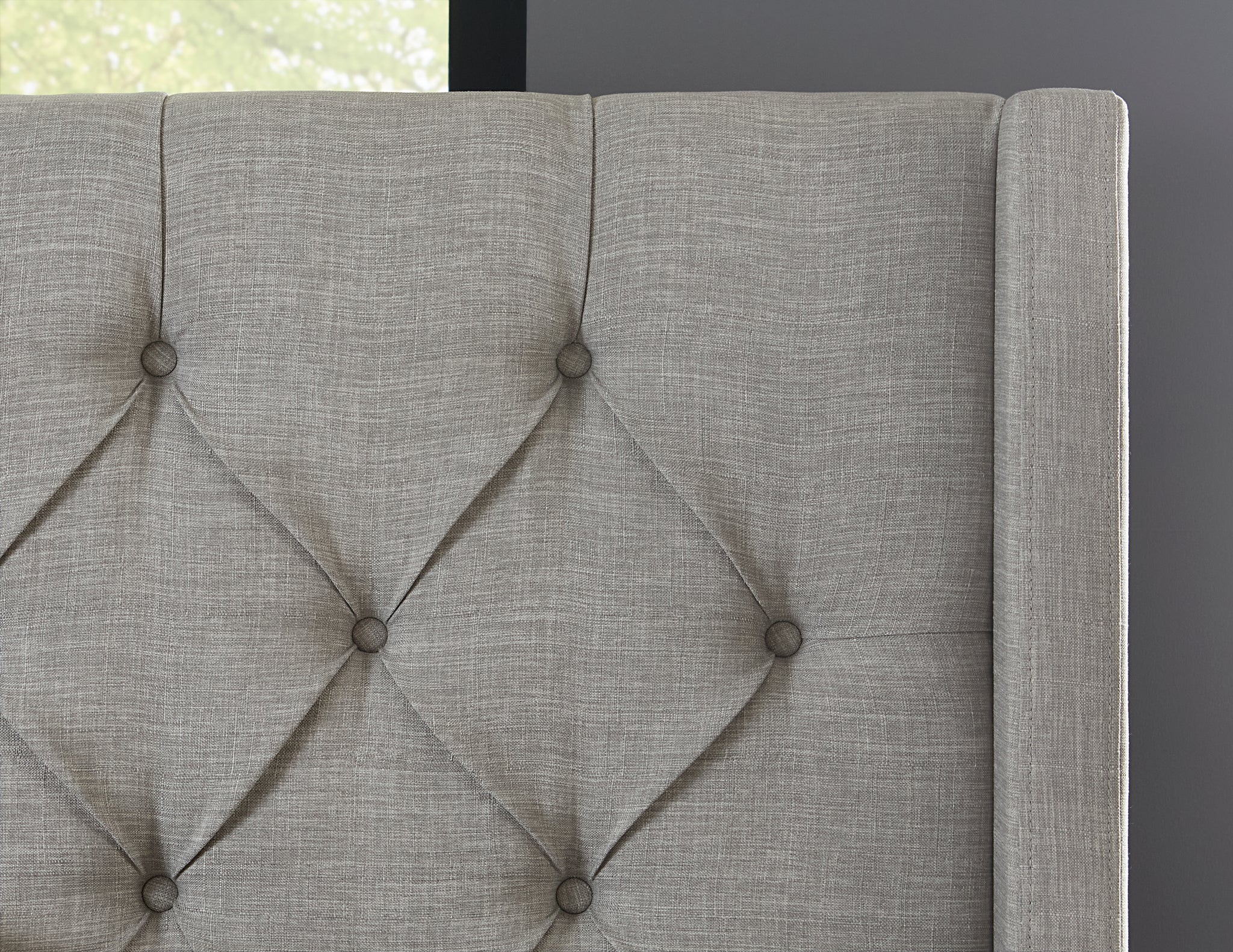 Indulgent tufting and cushioning surround you in luxury with the Geneva upholstered bed collection from Modus. Available as headboards or complete beds, each model is wrapped from head to toe in a textural linen fabric for a tailored finish. With styles ranging from sleek and modern to lavishly hand tufted, the Geneva collection features elegant details like hand-hammered nails, high arching curves and piped edges that highlight each angle and shape. Large headboards let you pile pillows high or present a clean, neutral expanse suited to any color palette. Tapered block feet are hand-finished in an Espresso tone, contrasting with the upholstery and broadening the range of compatible colors. Our custom-fit platform bed frame is upholstered in the same linen fabric and includes a European-style bentwood mattress support designed for use without a box spring. Headboards feature built-in levelers and fit standard metal frames with threaded inserts at 5 5/8, 6 1/4, 8 1/8 and 8 3/4 above floor level. Hole centers are 59 inches in queen, 71 in California King and 75 in King. Headboards fit most non-standard frames with a Modi-plate (available from most metal frame manufacturers).Features:
