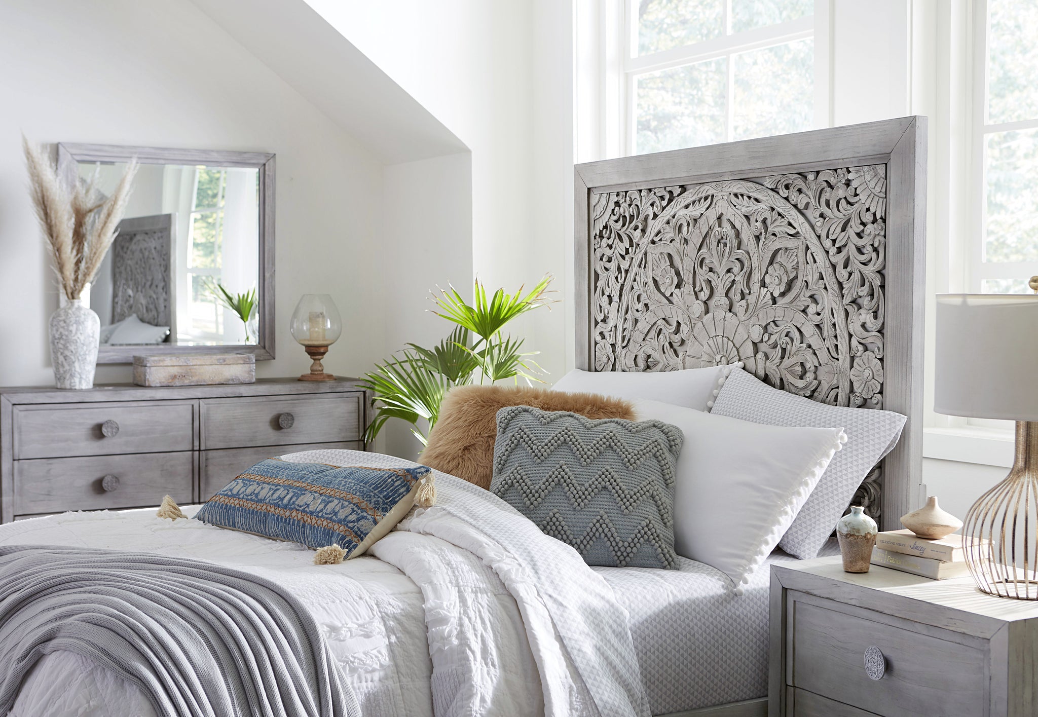 Add a Bohemian style to your bedroom with the globally inspired Boho Chic collection. The high headboard and gentleman’s chest are intricately carved with a mandala pattern, a spiritual symbol that is said to establish a sacred space. Crisp edges, delicately curved feet and carved drawer pulls complete the look.