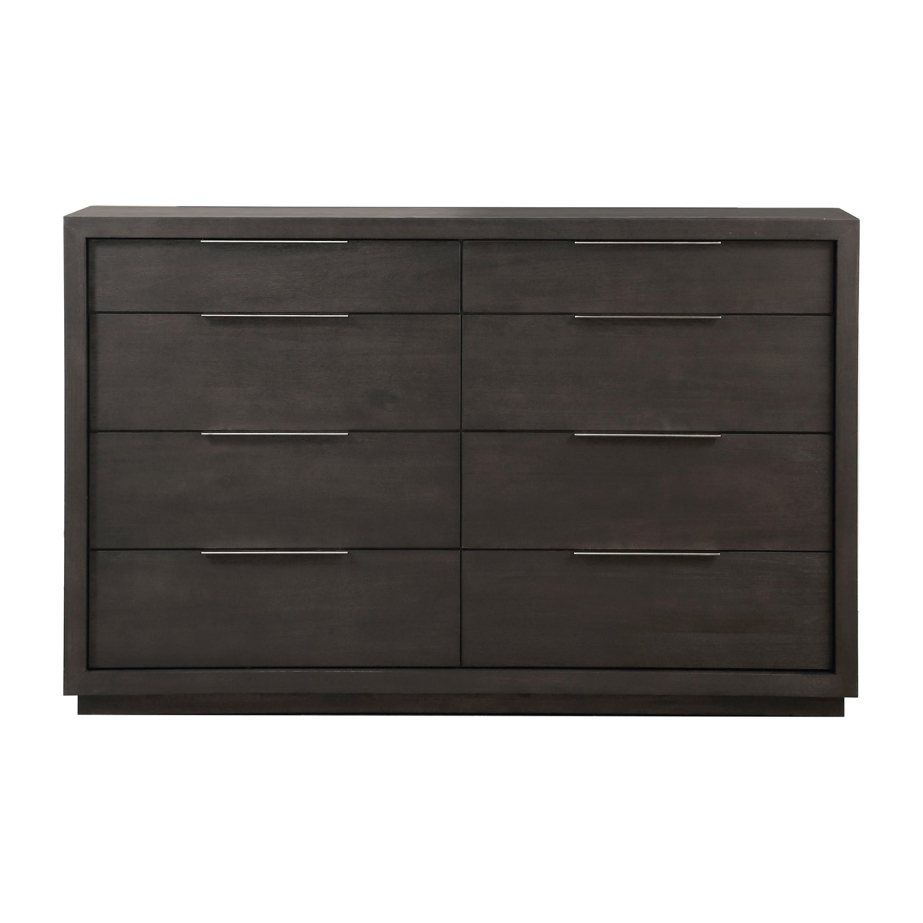 The sleekly tailored Oxford collection makes a striking first impression with bold proportions, crisp, modern lines and a weathered finish. Smartly accented with top-mounted nickel plated pulls, concealed footboard storage, and a floating plinth base. Available in Basalt Grey.Features: