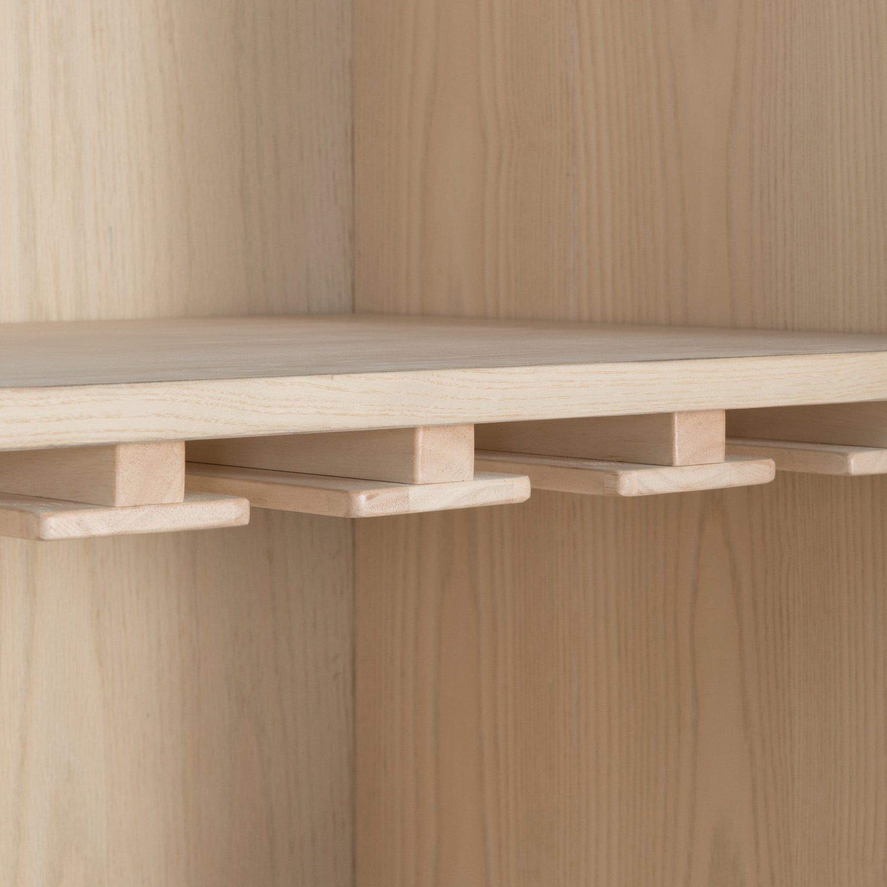 - Feature packed interior includes 8 bottle storage cubbies, 2 drawers, pull out shelf and 32 glass stemware rack