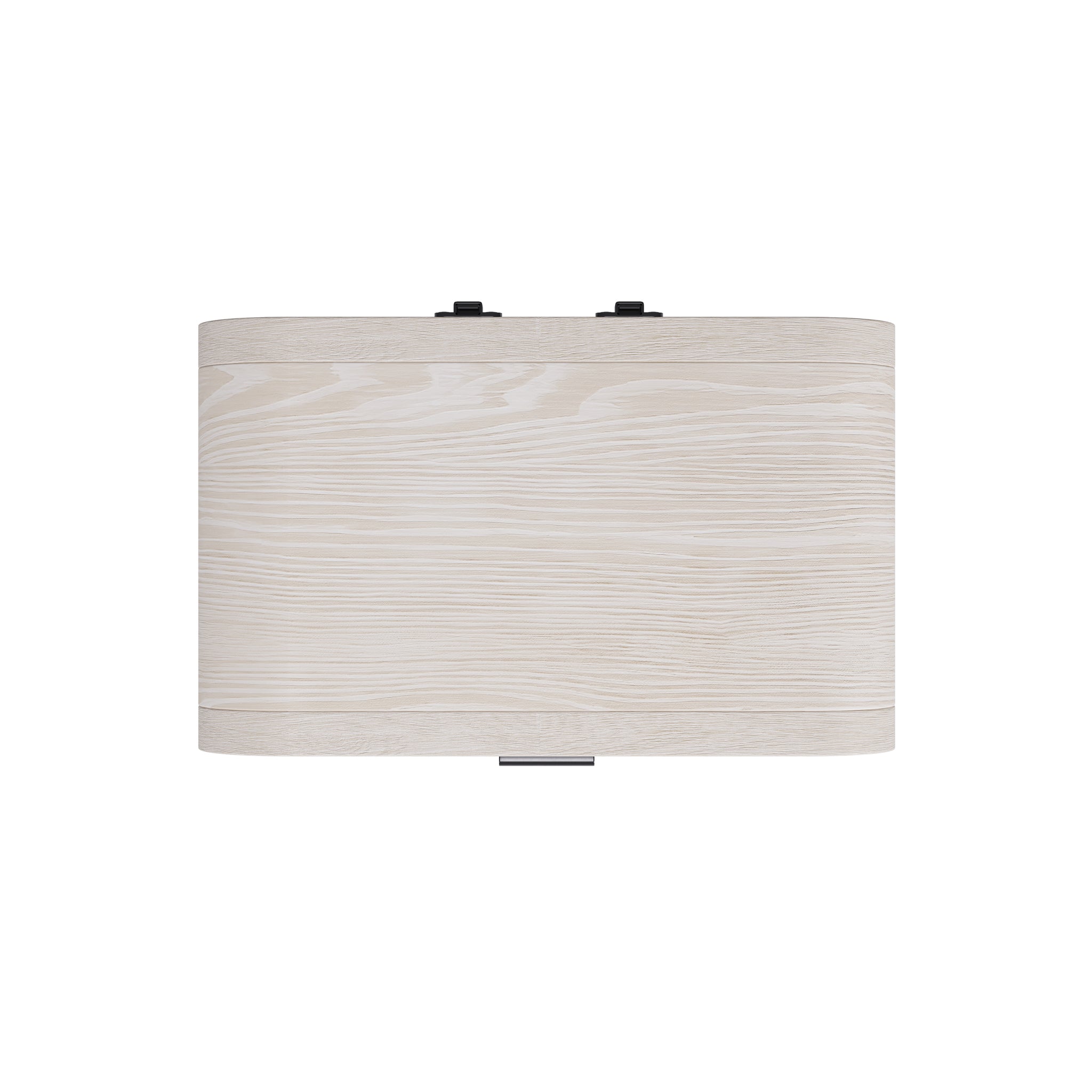 This soft modern collection blends classic minimalist lines with waterfall edges in a striking unexpected arrangement. Ash wood veneer and solid hardwood surfaces are gently wire brushed to enhance the wood's natural texture and finished in a modern white wash for a look that's at once modern, coastal and cottage.