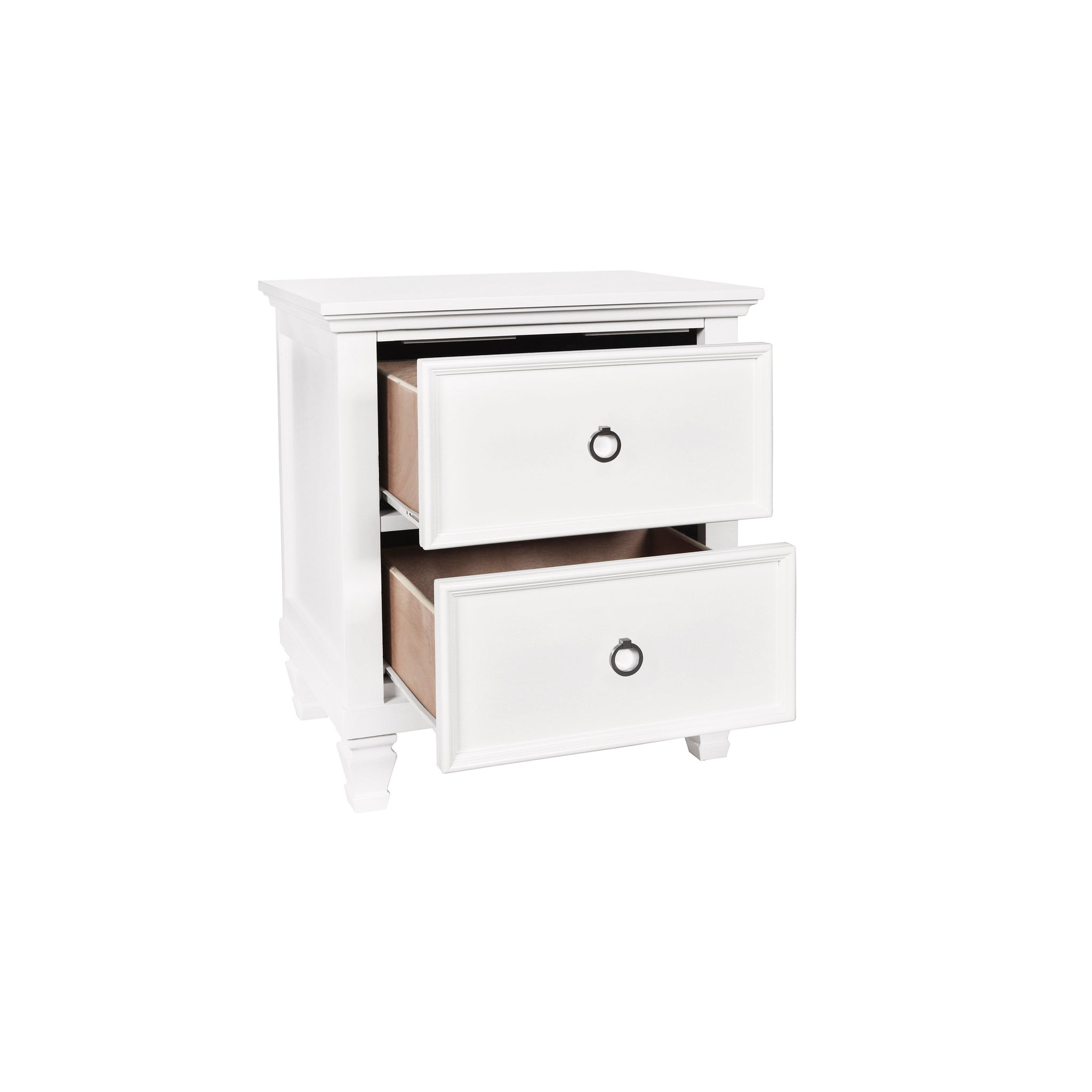 The Tamarack 2 Drawer Wood Nightstand in white combines durability with elegance. Built with solid poplar, basswood veneers, and eco-friendly manufactured wood, this nightstand ensures strength and long-lasting durability. Its versatile transitional design seamlessly blends contemporary clean lines with classic paneled detailing, creating a perfect harmony of modern and traditional aesthetics. The chic white finish adds a touch of sophistication and modernity, enhancing the overall aesthetic and complementing any decor style. Quality drawer construction ensures smooth operation with side-mounted glides and the durability of English dovetail joinery on both the front and back, guaranteeing long-lasting use. Fully finished drawers provide snag-free storage, while the felt-lined top drawer protects your delicates. This nightstand is an excellent addition to any bedroom, offering both style and functionality.