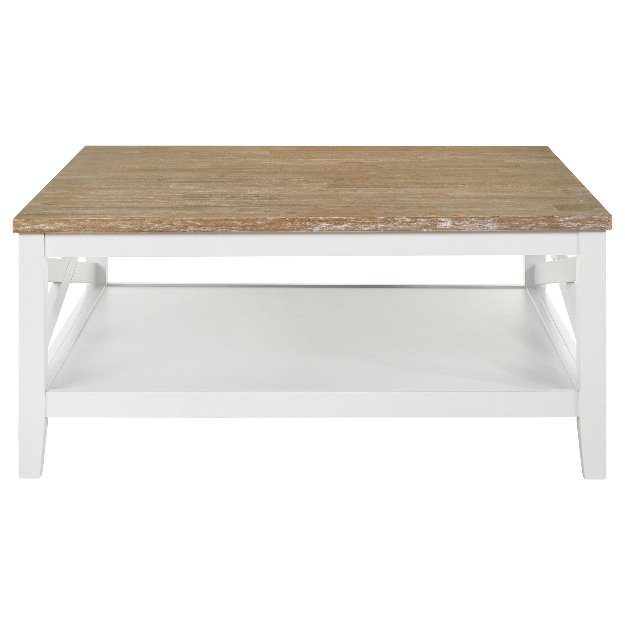A square silhouette established a welcoming look and feel for a farmhouse coffee table. Great for family spaces, the cocktail table lends casual elegance with style that complements cottage, coastal and relaxed sitting areas. Its table top is wire brushed to create texture and dimension on ash veneer in a medium brown finish thats warm and inviting. A contrasting base shows off a crisp white finish and X-cross details that add farmhouse charm to your favorite gathering space. A full lower shelf completes the look with space for storage and decor that adds a personal touch.
