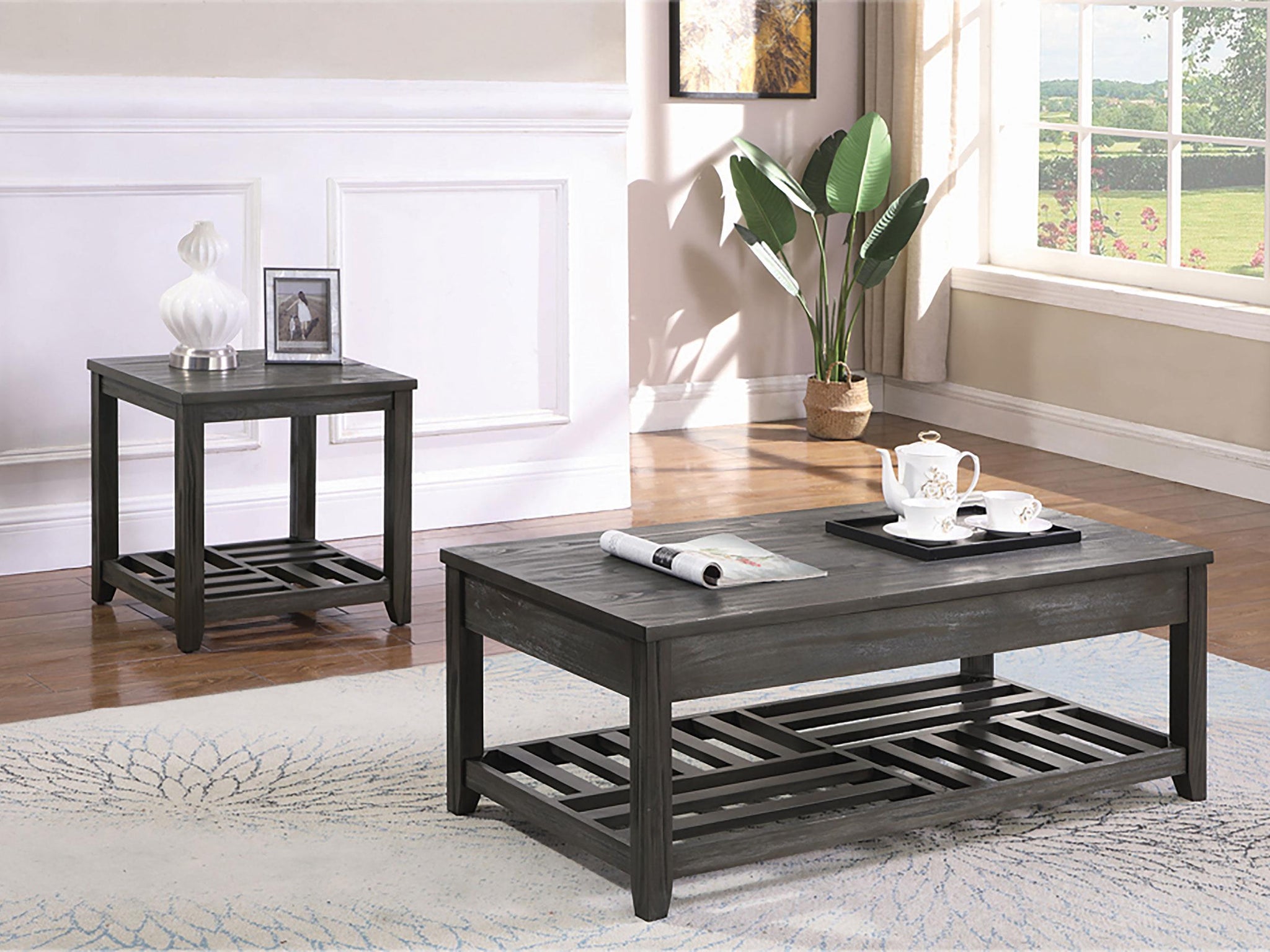 This coffee table blends clean lines with a spacious, functional design. The rectangular tabletop provides ample room for decor or serving essentials, making it perfect for gatherings. A slatted lower shelf with a checkerboard-inspired design offers extra storage and a creative touch. Crafted from durable engineered wood with pine veneer, it features a grey finish with wood grain accents, adding rustic charm to any living room. Tapered legs complete the timeless appeal of this versatile piece.