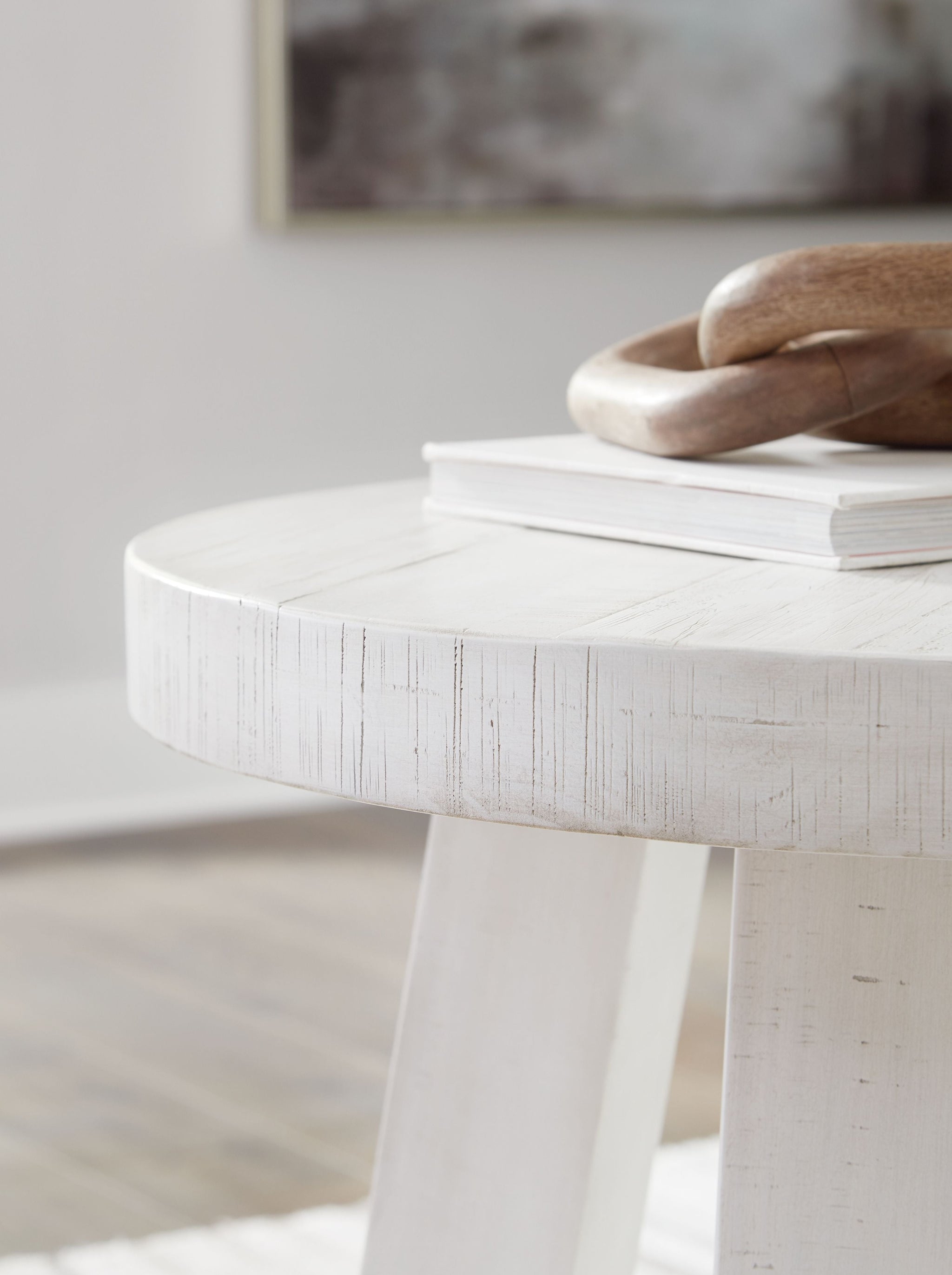 Carefully crafted with farmhouse appeal, this end table features braced posts and a thick round tabletop. The off-white finish adds depth and character to its simple silhouette. You wont be able to resist the organic appeal of this versatile piece.