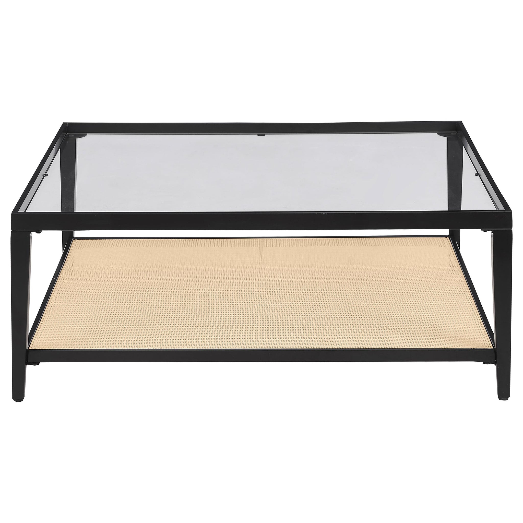 Enhance your living room with the contemporary charm of this sleek square coffee table. The black powder-coated metal frame creates a clean, modern aesthetic, while the recessed clear tempered glass top provides an elegant and spacious surface for your decor or coffee essentials. Below, a shelf crafted from radio weave polyethylene (PE) rattan adds a unique texture and convenient storage, blending natural materials with modern design. This cocktail table brings a sophisticated, functional touch to any seating area, making it the perfect centerpiece for a stylish living room. Its versatile design complements various décor styles, elevating your space with ease.
