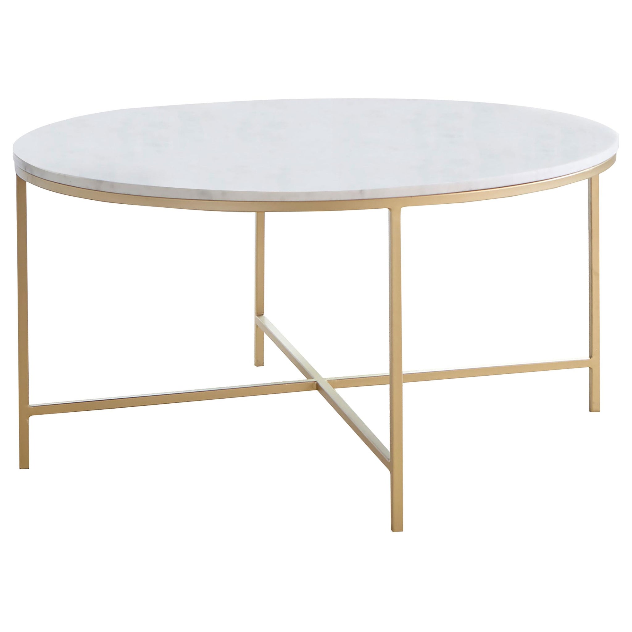 This round coffee table features a genuine white marble top, adding a sophisticated touch to any living room. The elegant marble surface is supported by a welded iron frame with a luxurious gold finish. Fully assembled and ready for use, this cocktail table requires no additional setup, offering convenience and style. Ideal for modern and contemporary interiors, it blends durable construction with premium materials.