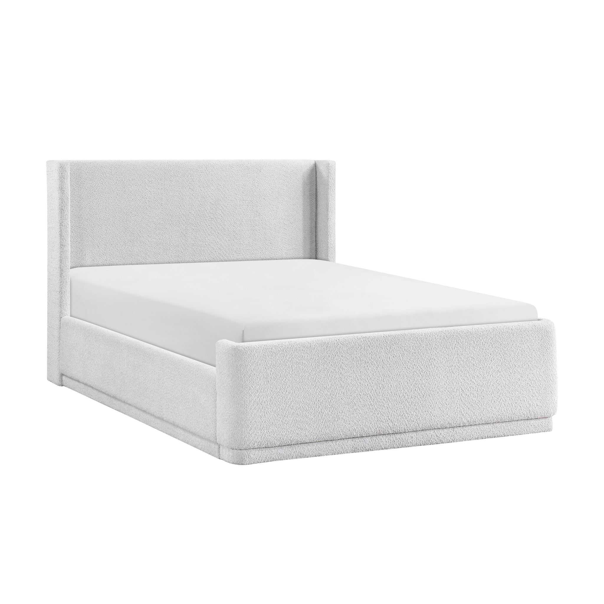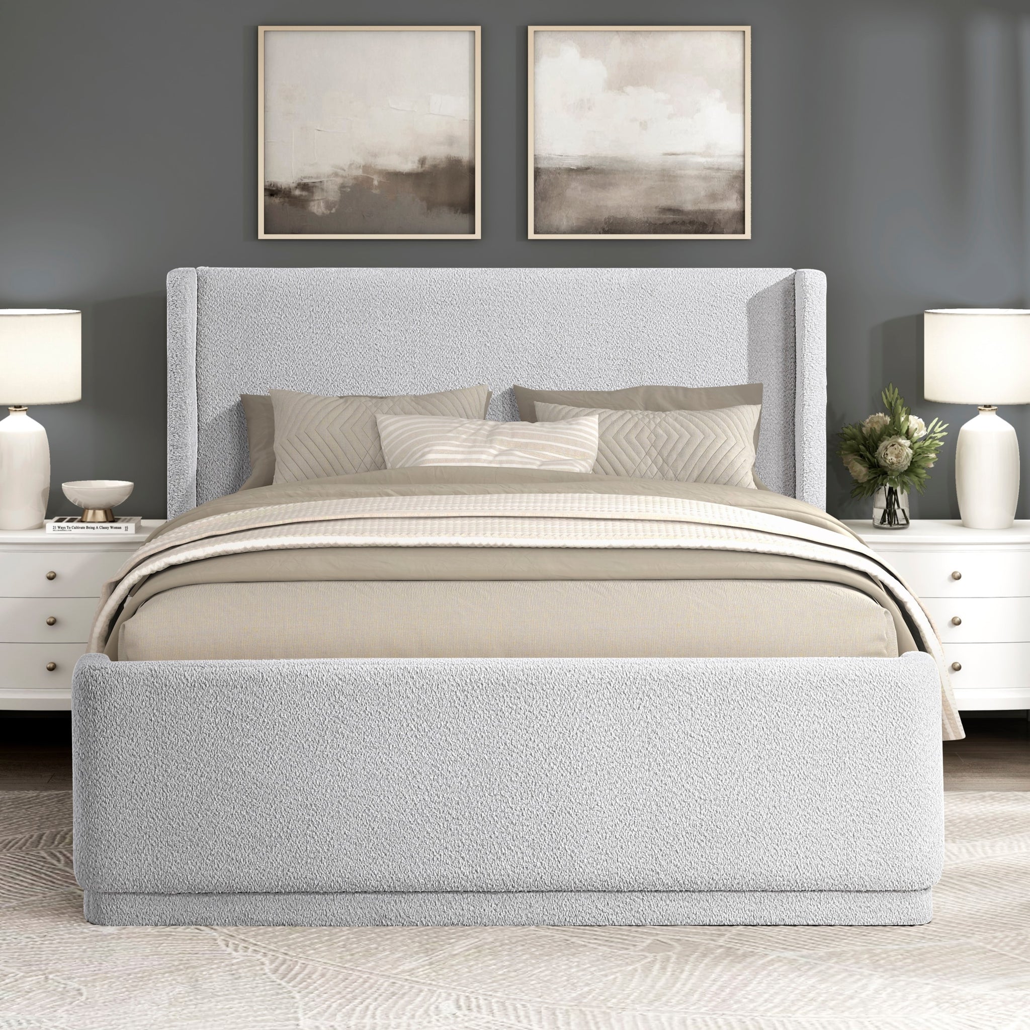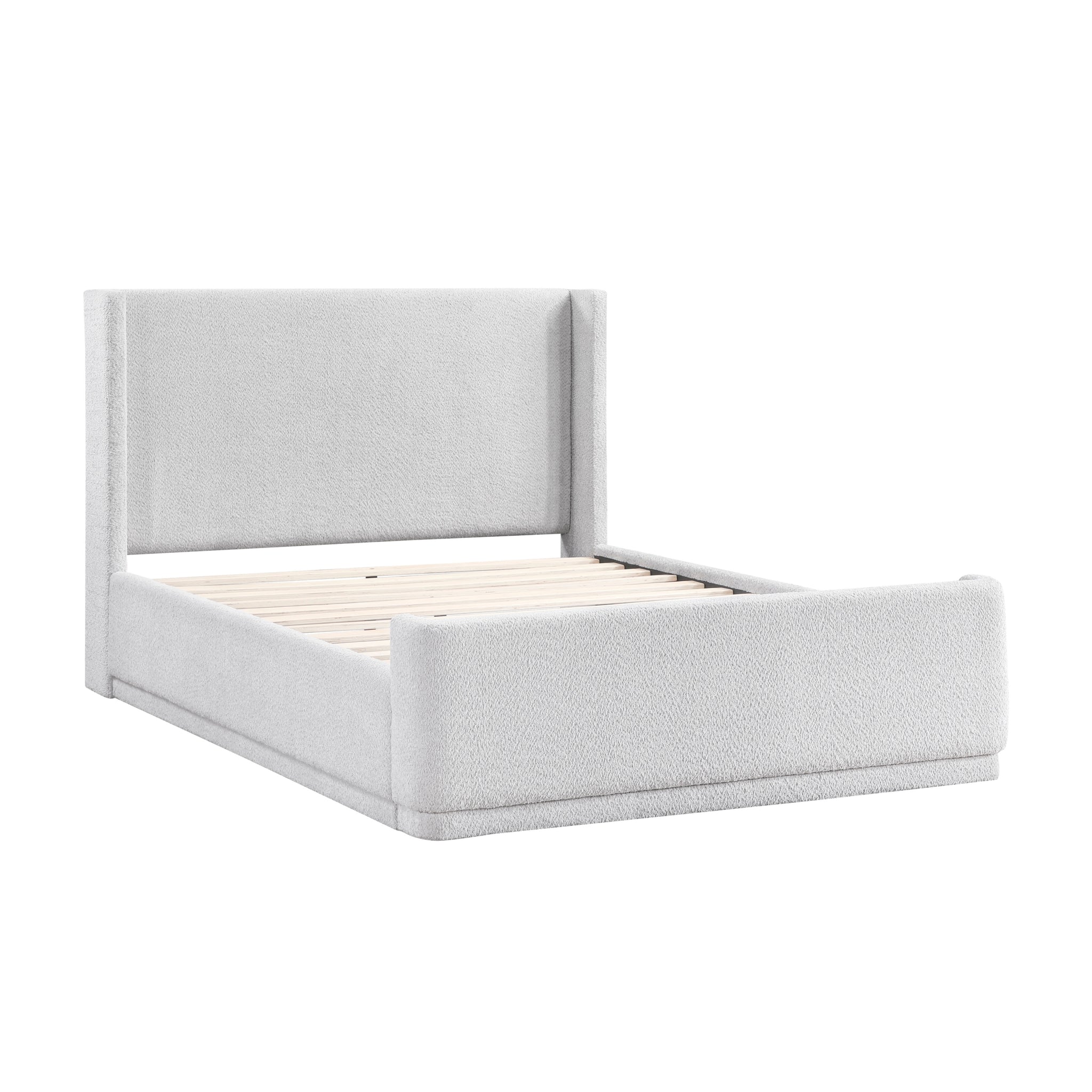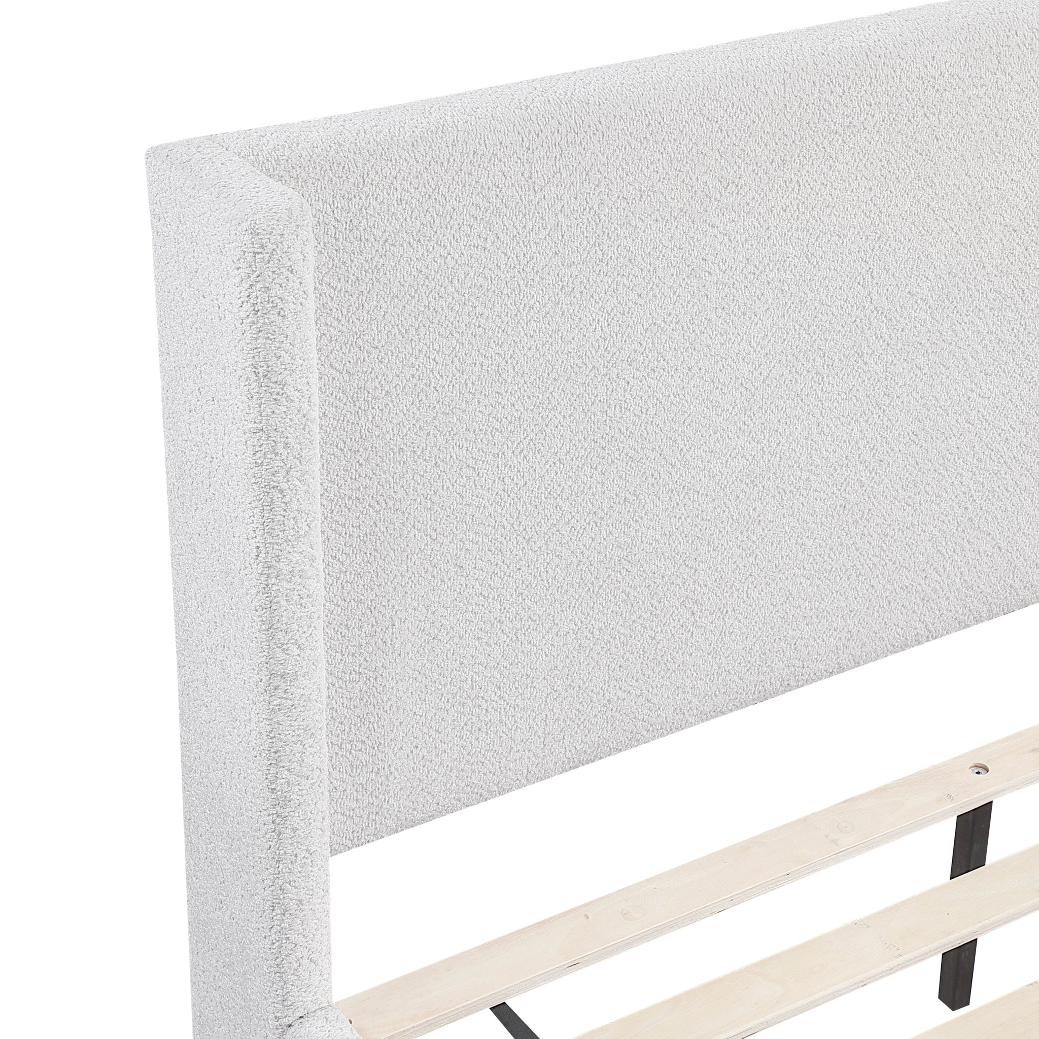 Add a touch of sophistication to your bedroom with this elegant queen-size platform bed. Designed with clean lines and modern flair, the bed features a sturdy plywood frame and a refined wingback headboard upholstered in soft, light gray textured fabric. Its low-profile design eliminates the need for a box spring, allowing you to place your mattress directly on the included slats for a streamlined look.