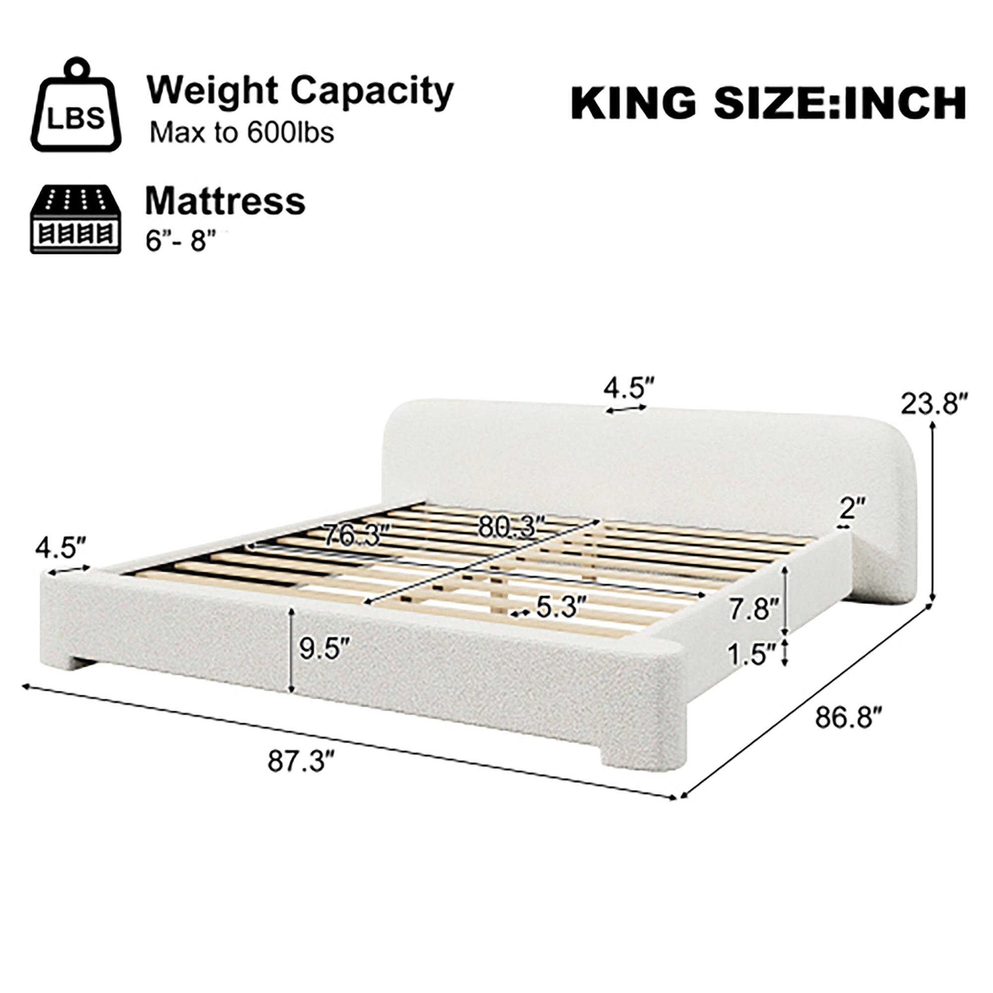 • Weight Capacity: Supports up to 600lbs for KING size, ensuring a stable sleep.