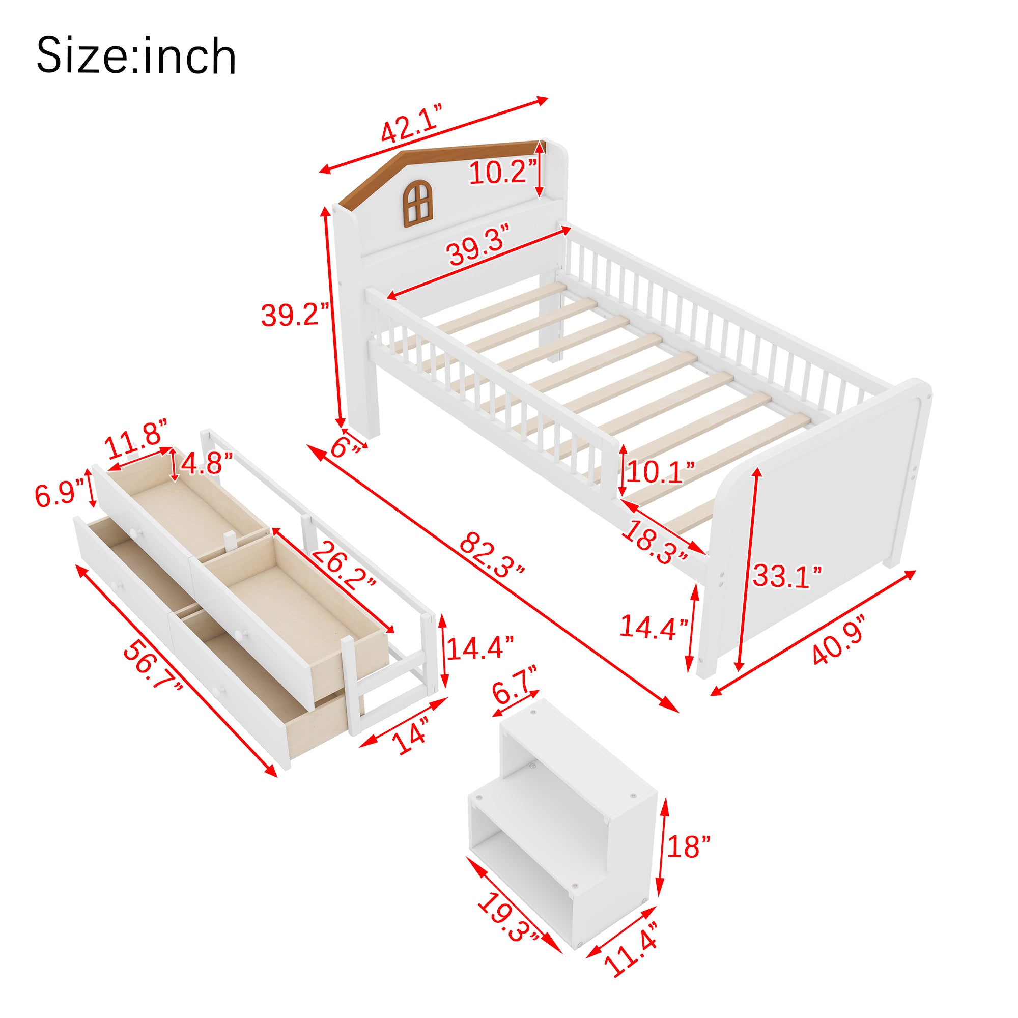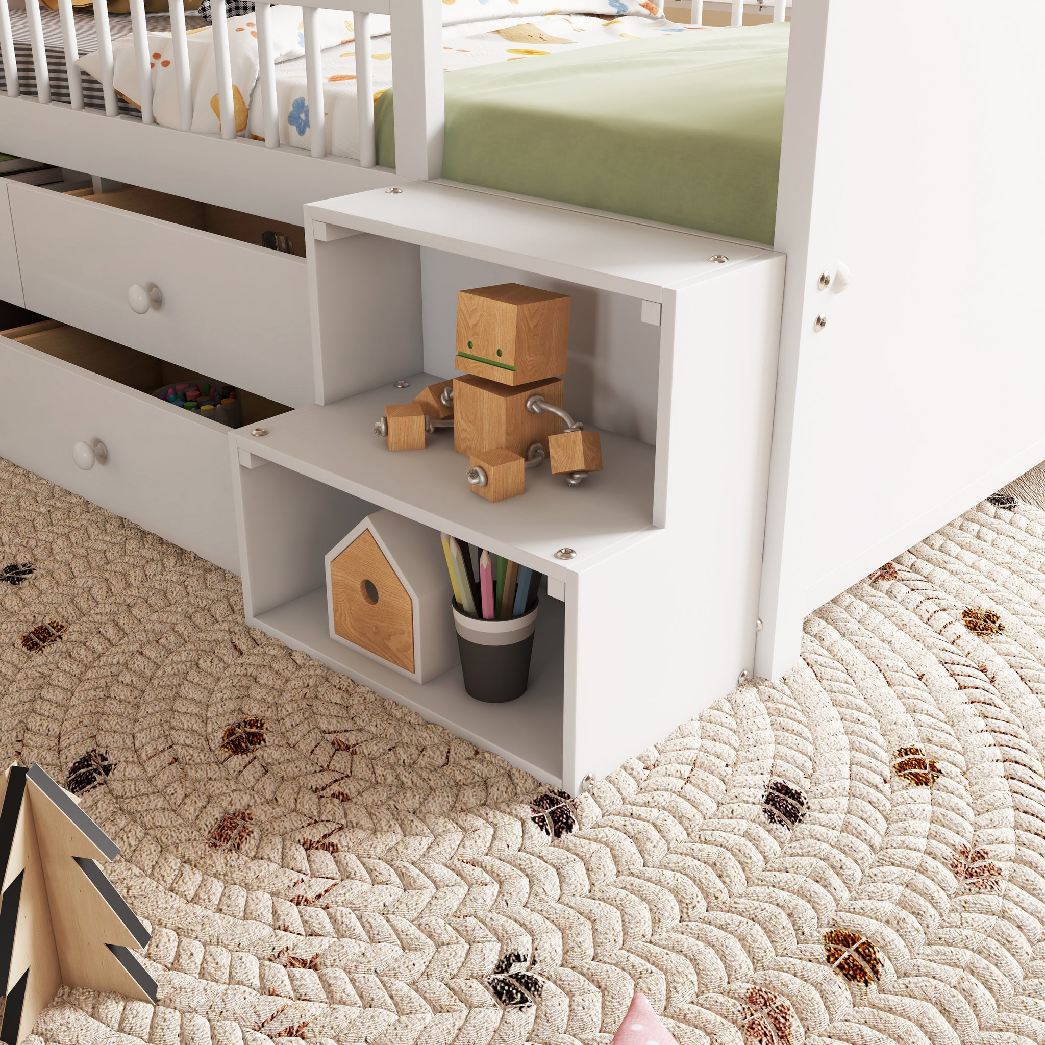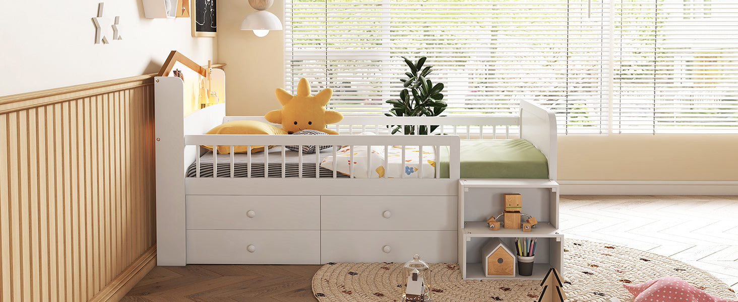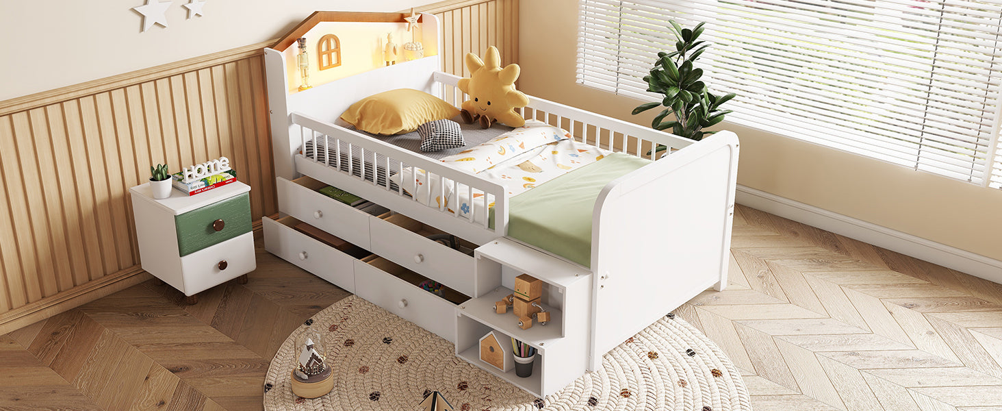• Kids Loft Bed with Storage Drawers:  The low loft bed takes up minimal space for your bed room. 4 underside storage drawers perfect for organizing clothes and other belongings, maximizing the use of space in the bedroom and help keep space tidy and organized.
