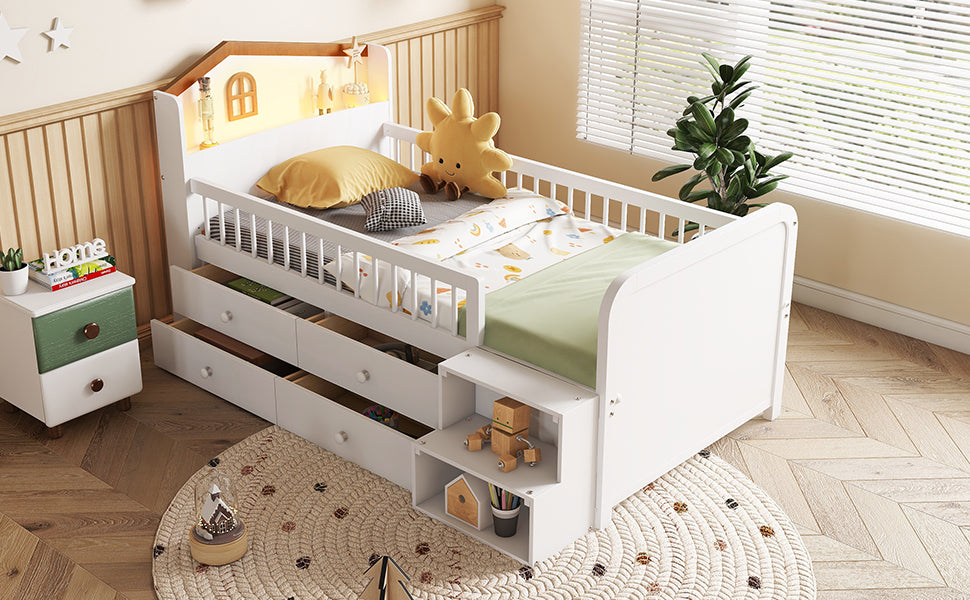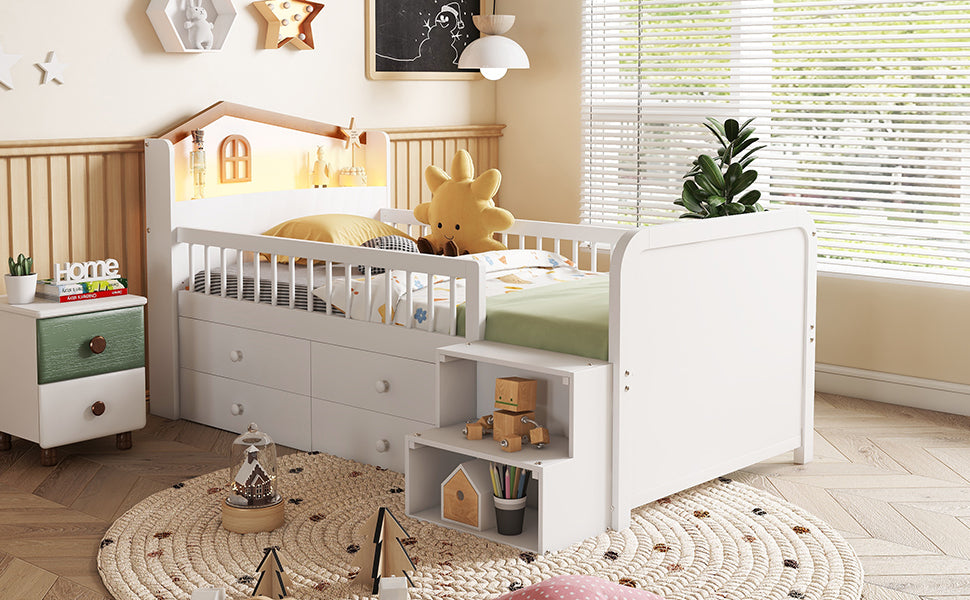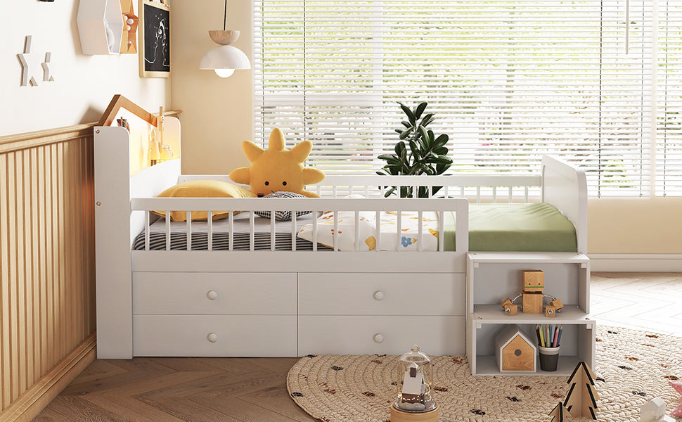 Low Wooden Twin Loft Bed with LED Lights and Storage Drawers, White