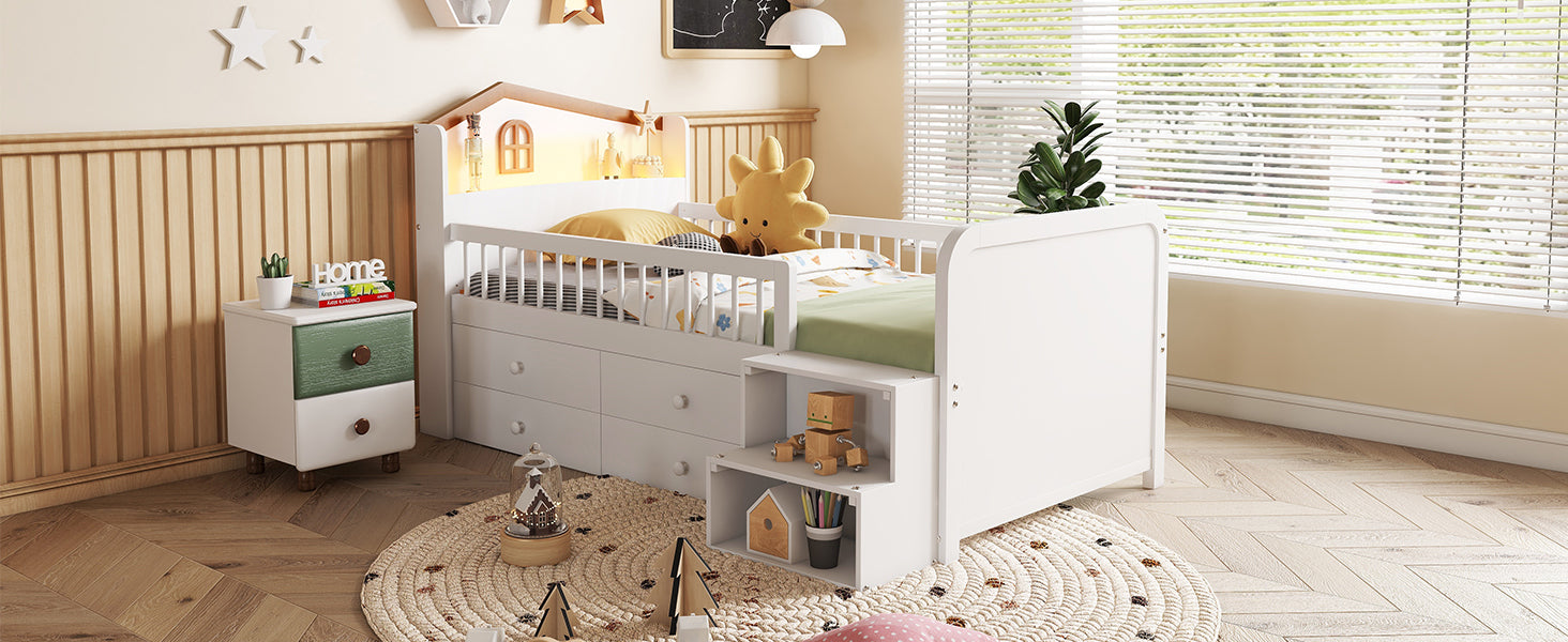 • House Shape Design: A house shaped headboard, complete with a window, this bed adds a rustic, country feel to your room. The headboard can store your clock, phones and other small things.