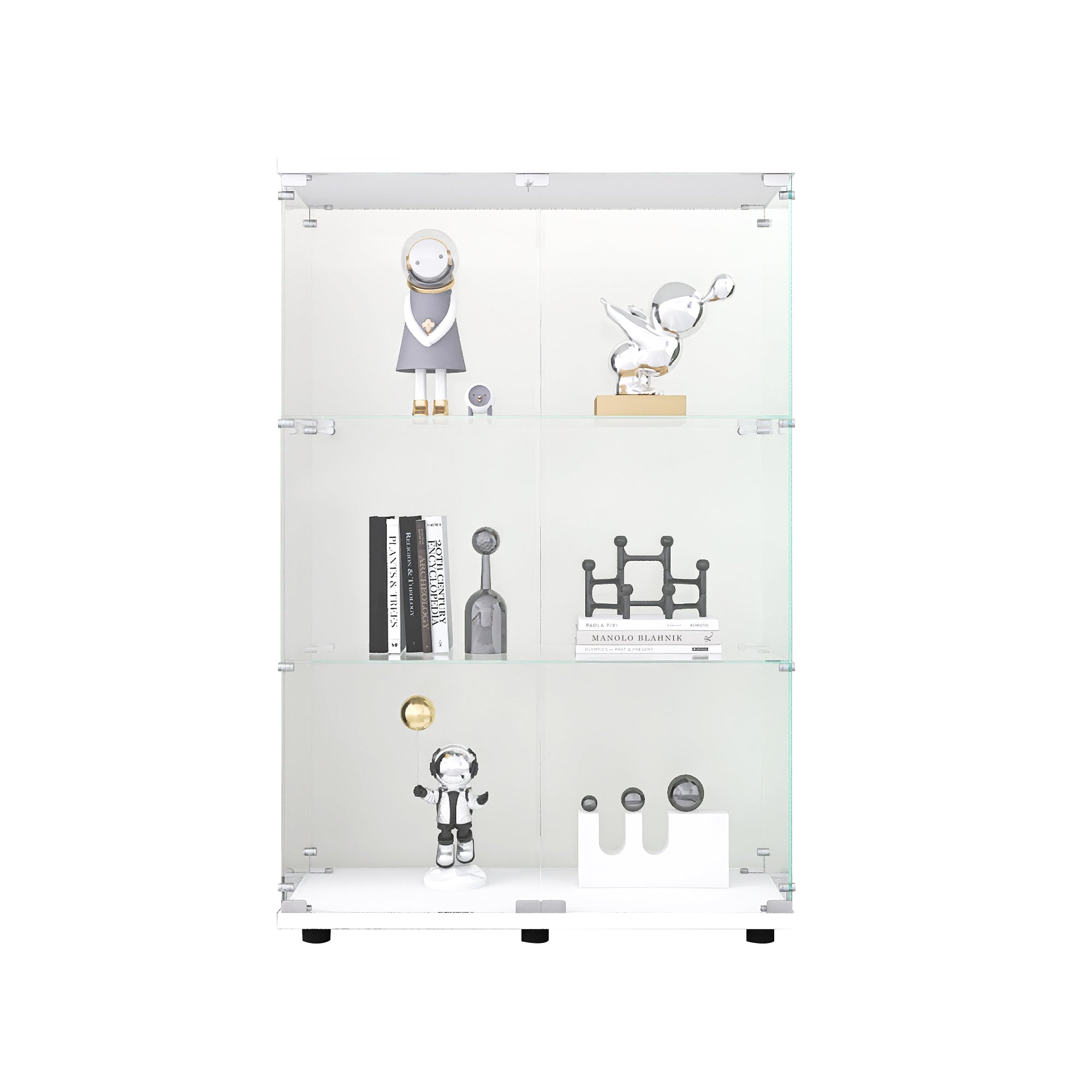 • Two-door Glass Display Cabinet: Size 49.3"(H) x 31.7"(L) x 14.3"(W) inches, each tempered glass is 4mm thick. 3-shelf design is sturdy and stylish to display Jewelry, Bags, Shoes, Figures, photos, books, action figures, wine and whisky; glass door is easy to open and close.