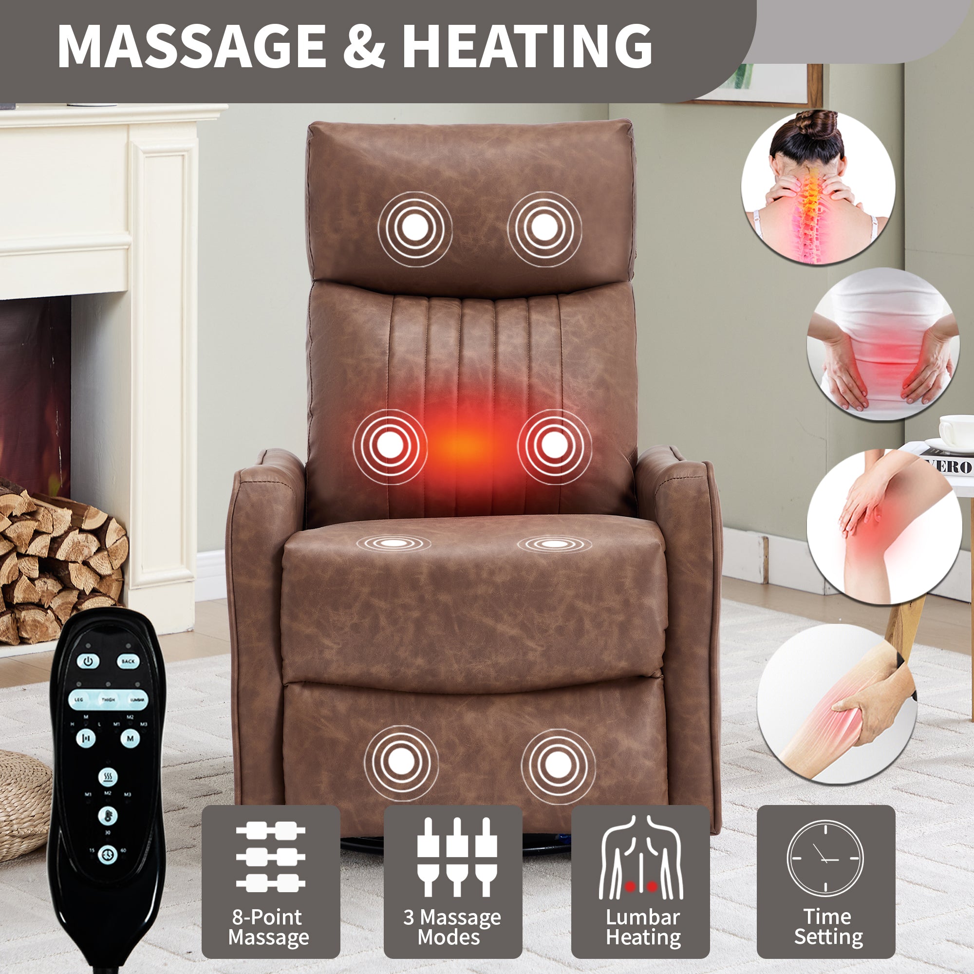 Brown Heat Massage Manual Recliner Chair with Rocker and Swivel in Faux Leather for Living Room