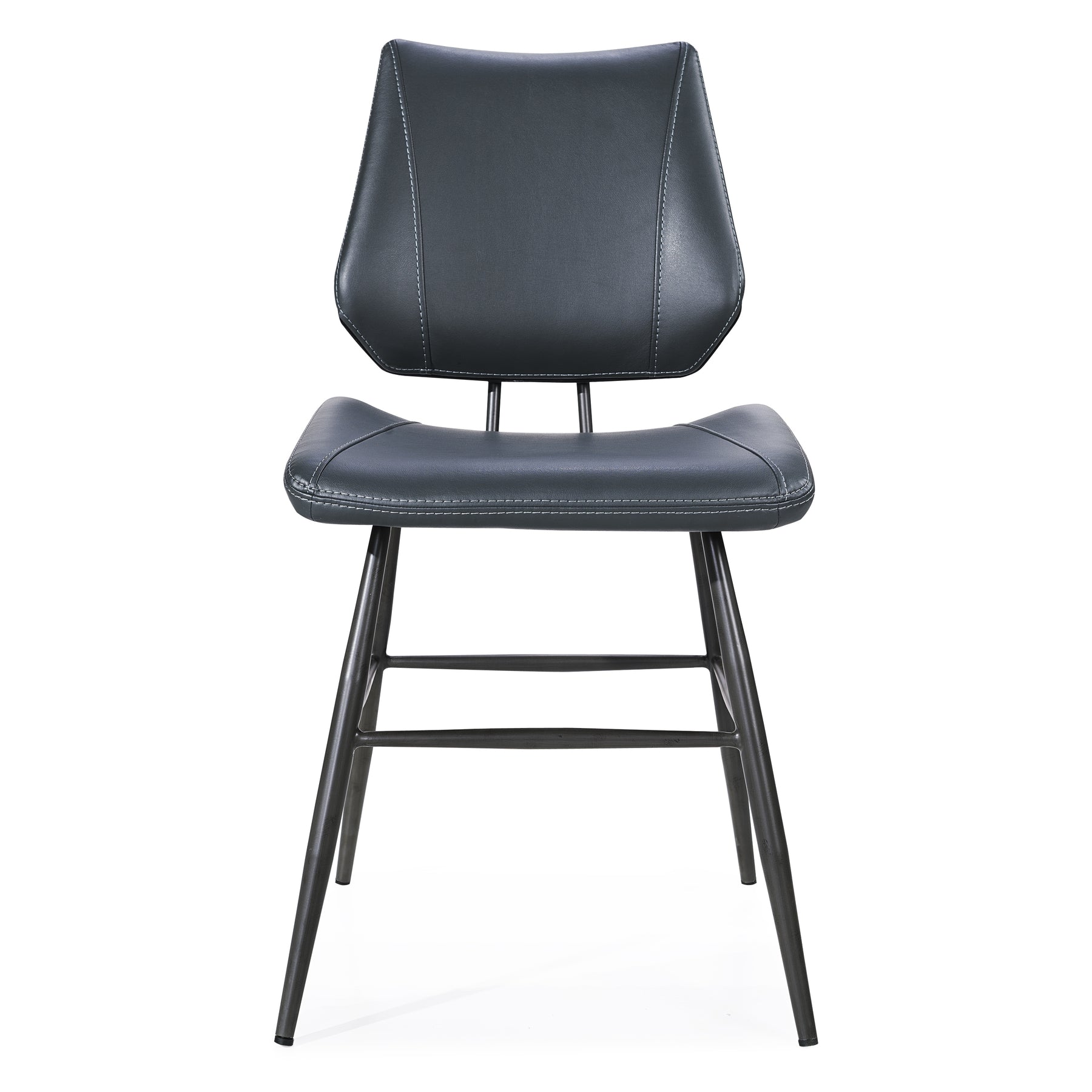 • With subtle shapes tightly wrapped in synthetic leather upholstery, this dining chair features tapered metal legs and stretchers, baseball stitching with contrast thread and a padded, pitched backrest