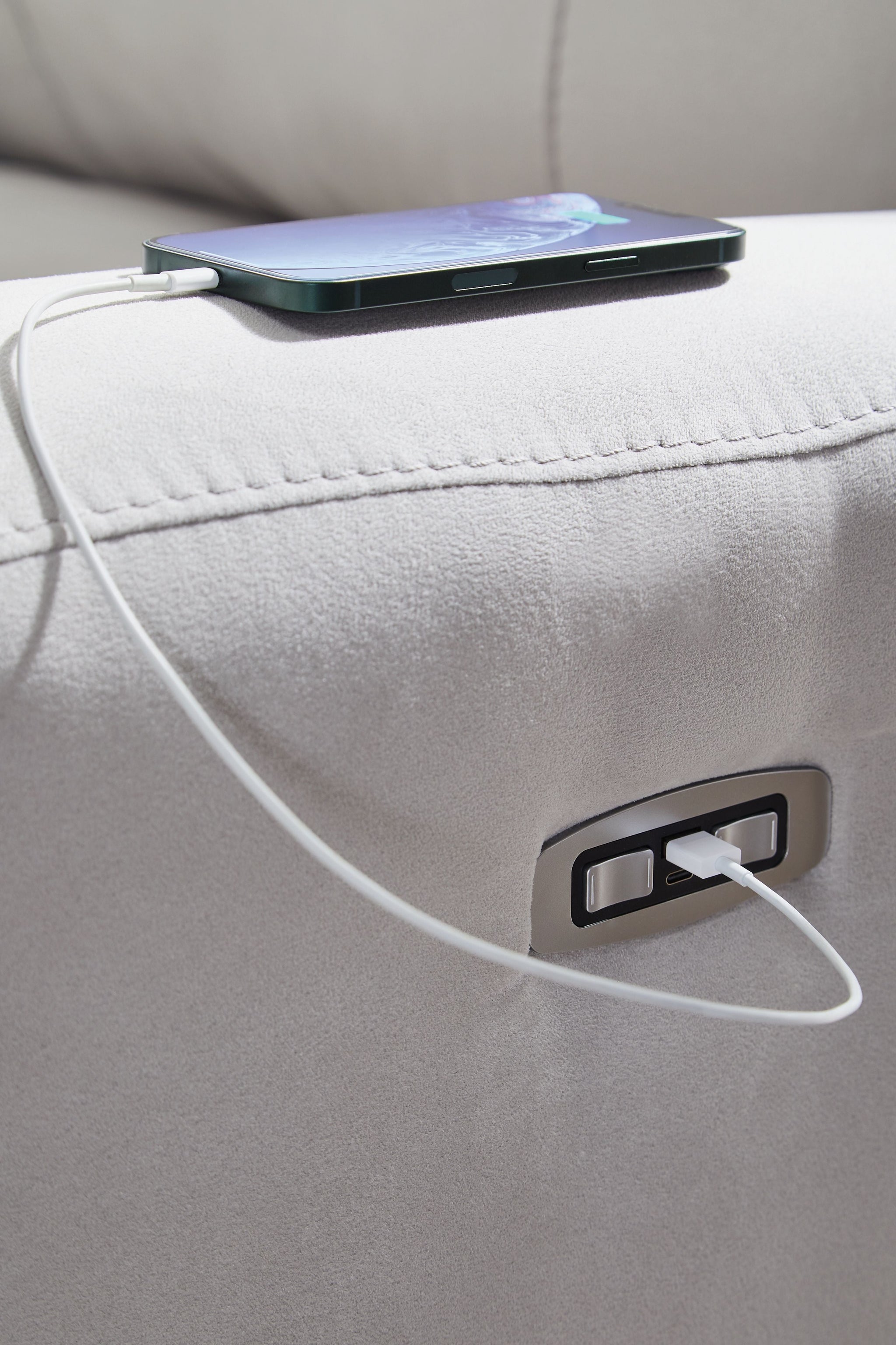 Smart, clean and ultra modern, this power reclining sectional is utterly in vogue. Youll love its indulgent cushions and contemporary bustle back styling. The sumptuous fabric, accentuated with contrasting welting, easily blends with your decor. A convenient console with storage and cup holders keeps essentials handy. And with reclining at the press of a button, this modular sectional proves chic design and superb comfort go hand in hand.