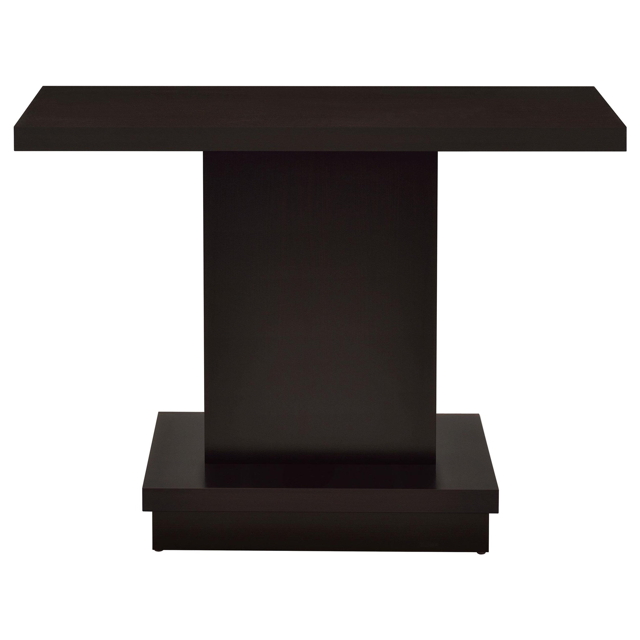 This sofa table delivers modern elegance with clean geometric lines and a versatile rectangular profile. Crafted from engineered wood with a scratch-resistant laminate veneer, it showcases a rich cappuccino finish that exudes contemporary charm. The spacious tabletop provides ample room for decor, storage, or everyday essentials. Perfect for use behind a sofa or in an entryway, this console table seamlessly blends style and functionality in any space.