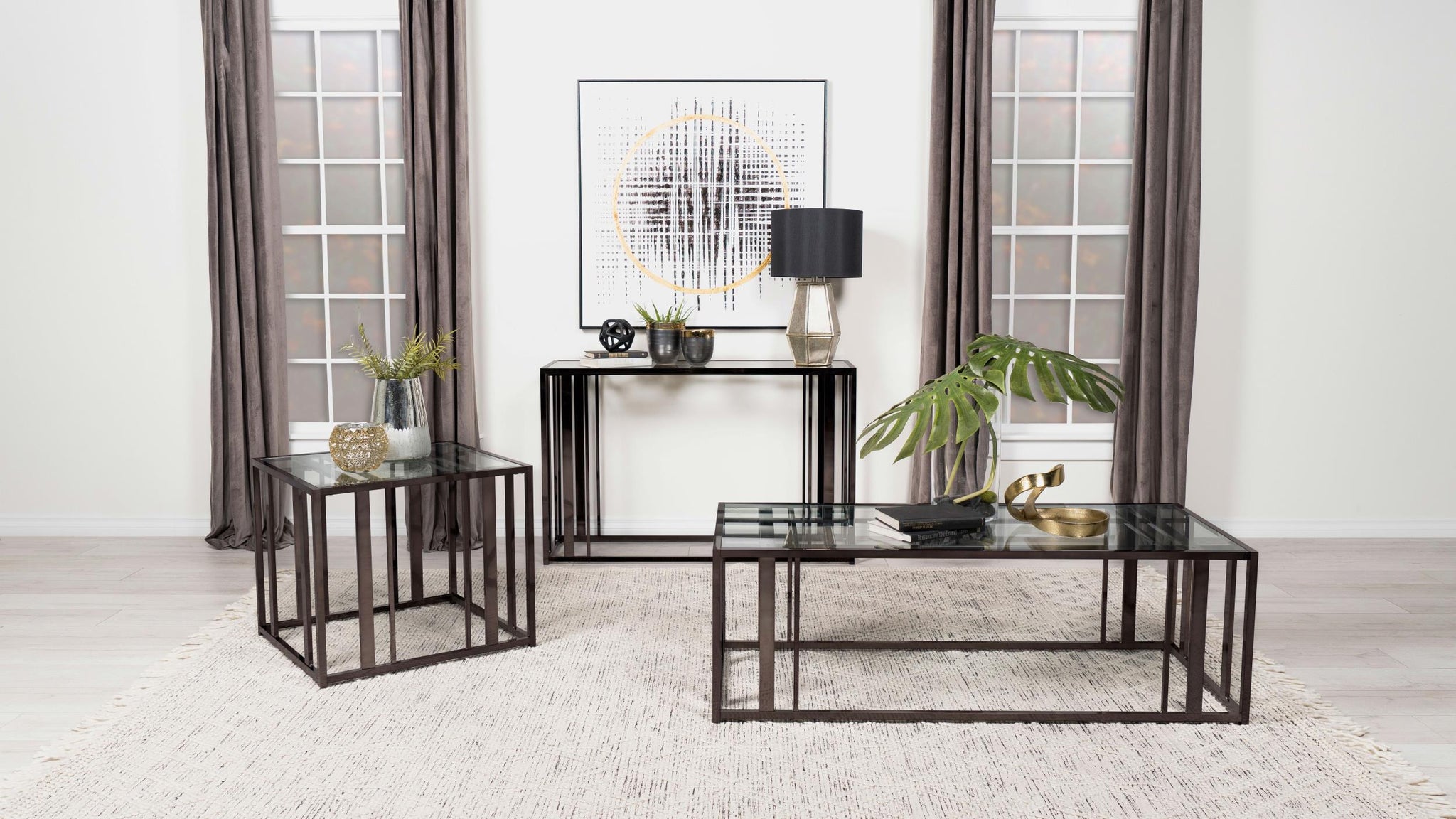 This modern rectangular console table features a clear tempered glass top paired with a geometric base crafted from heavy-gauge metal with a sleek electroplated finish. The open design creates a contemporary aesthetic, offering both elegance and durability. Ideal for placement in entryways, hallways, or behind sofas, this console table provides a spacious surface for displaying decor or organizing essentials. Its scratch-resistant materials ensure long-lasting quality with easy maintenance.