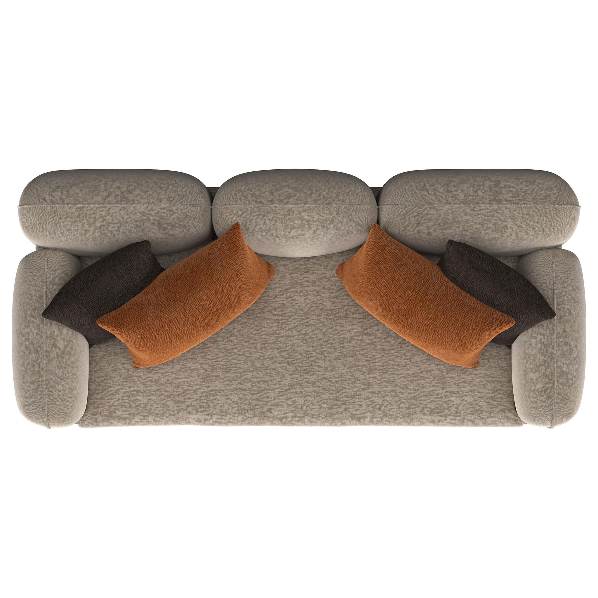 Experience a sophisticated blend of architectural design and plush comfort with this sofa. The latte chenille upholstery provides a subtle textured appeal, complemented by sculpted round arms and a matching back that mirror each other’s clean lines. Its waterfall bench seat offers a seamless look, supported by a sinuous spring seat deck and full foam cushioning for superior comfort. Reversible rust and chocolate accent pillows add warmth, while sleek, tapered metal legs complete its contemporary charm.