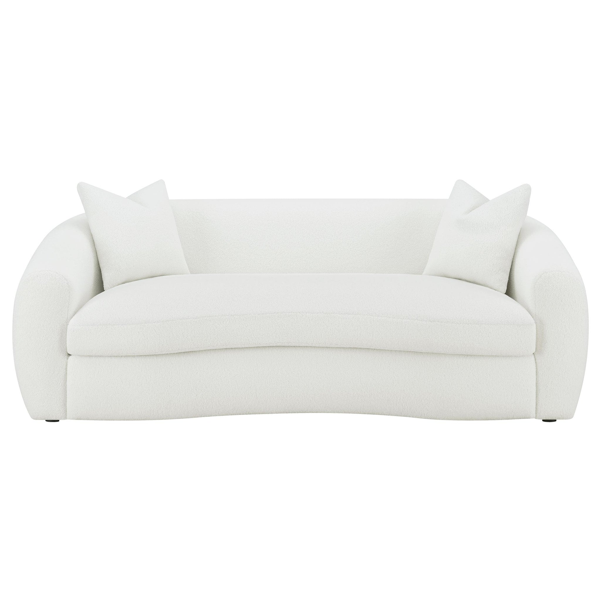 Create your inviting living room with this contemporary natural sofa, upholstered in boucle upholstery throughout its gracefully designed, contoured silhouette and elegantly sloped armrests. Matching accent pillows with premium faux down fill offer extra coziness and comfort to the curved bench cushion and tailored backrest.
