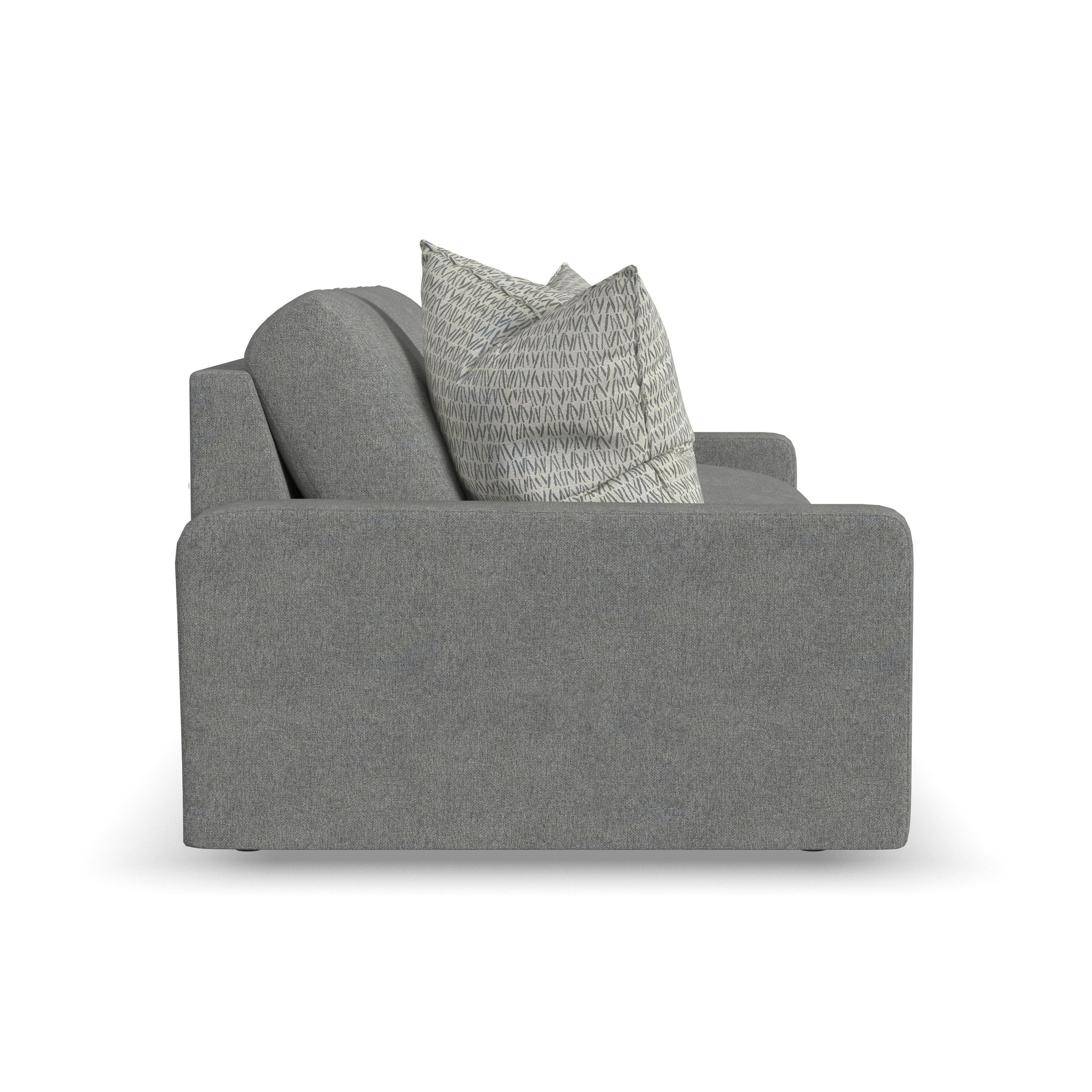 - A contemporary silhouette with clean lines, low track arms and recessed legs