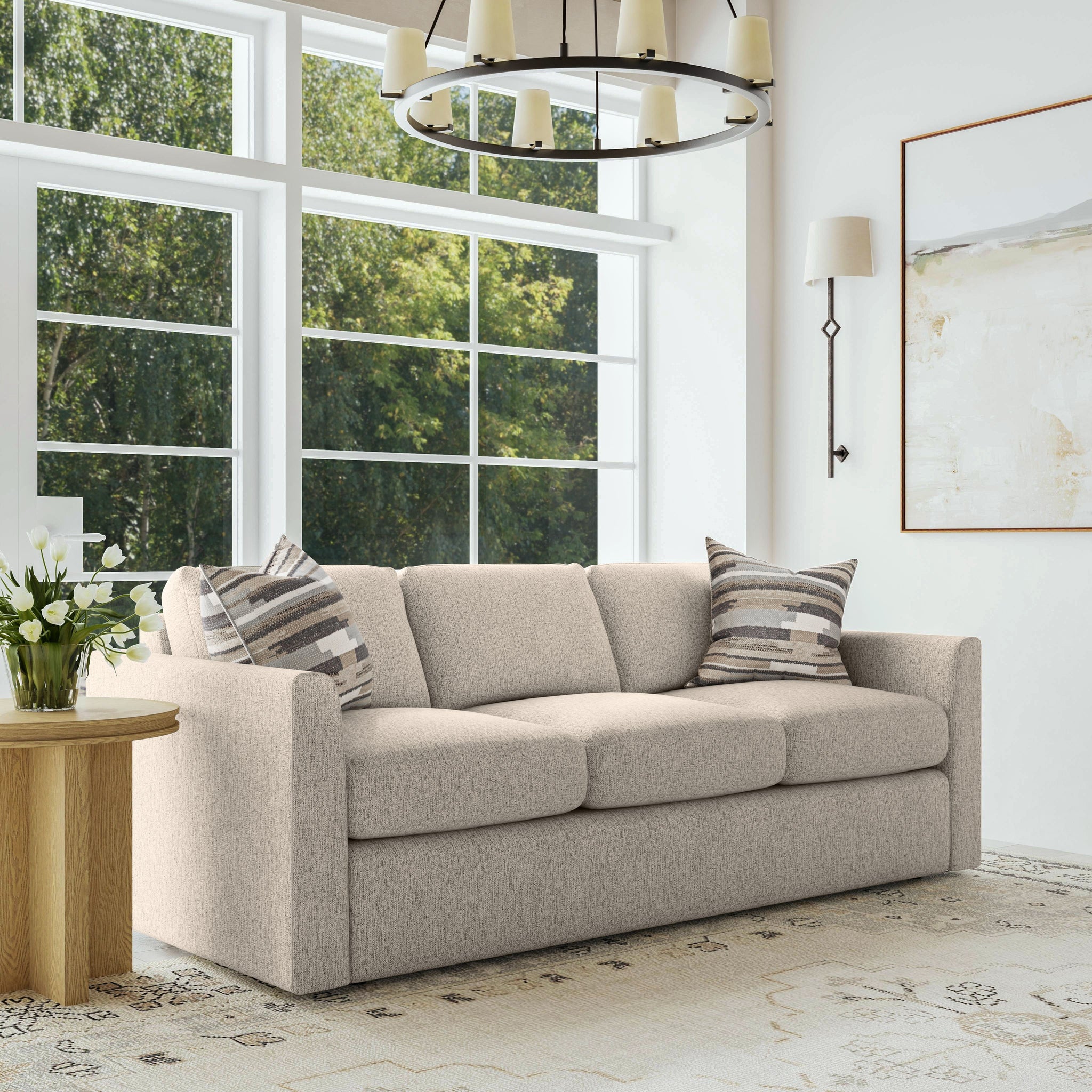 Cradle Yourself In Cloud-Like Comfort. You’ll experience the comfort of floating on a cloud as you relax or entertain on the Sky sofa. Featuring recessed legs, a low, deep profile and sophisticated flare arms, the Sky sofa offers a modern look that’s like a breath of fresh air. Surround yourself in lofty, luxurious comfort with removable, reversible seat and back cushions filled with a premium hypoallergenic polyester fill that feels just like down. With hundreds of fabric choices, you can design the Sky sofa to perfectly suit your home.
