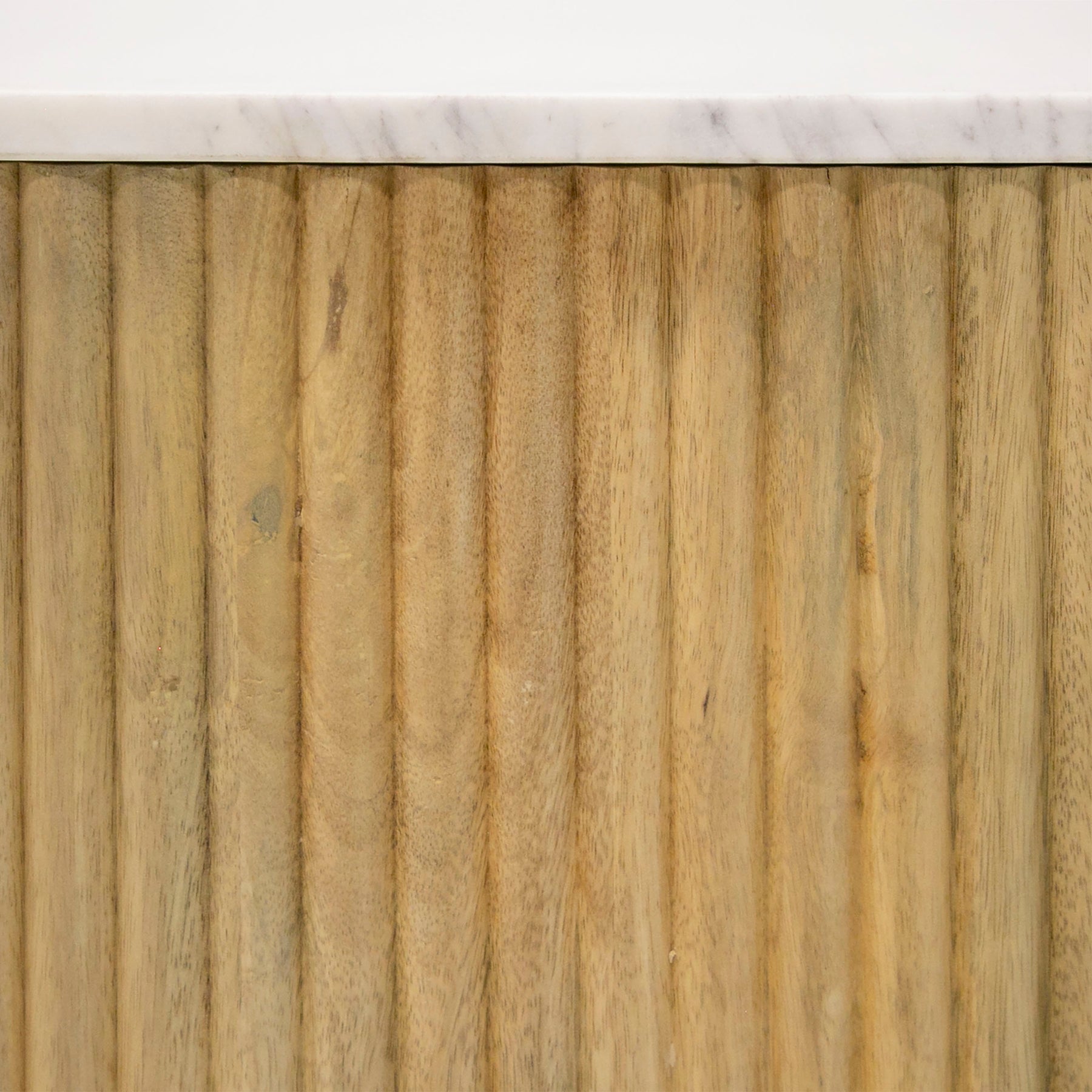 The Cambridge TV stand is large enough to support up to a 55-inch TV and support 100 pounds. With its two cabinets and open shelving, there is no shortage of storage space. Combine this modern white marble and mango wood TV stand with other items from the same Cambridge collection.