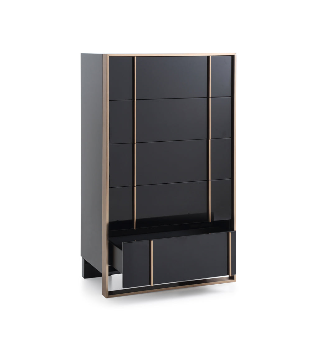 The Nova Domus Cartier Chest Is a credit to its brilliant designer. The soft rose gold metal framing masterfully surrounds the bold black high gloss of the chest. Five soft closing drawers create ultimate functionality. Perfect for a glamourous modern home, this Chest will pair perfectly with the Cartier Nightstand, Bed, and Dresser for a full set.