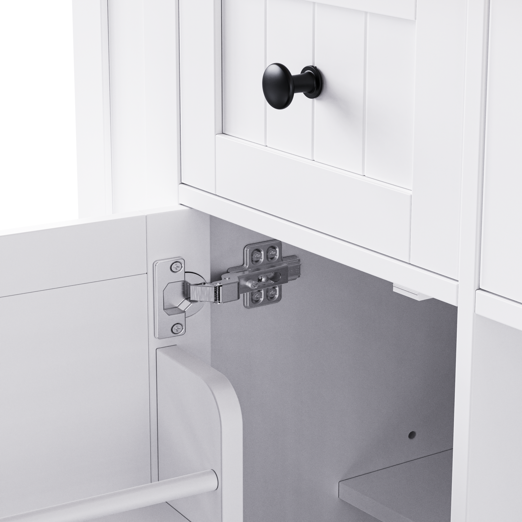 The kitchen island fuses classic style, high-end details, and versatile storage. Crafted from CARB Phase II certified MDF boards, its 50''-wide countertop features a smooth, scratch-proof laminate finish table that's great for food prep. The island includes an abundance of storage options: Two cabinets contain a 2-tier door interior storage rack for spice and jars, while 2 side open shelves with bamboo sticks specifically designed for organizing spices, bottles, and wine. Power outlets and towel racks on the same side add another level of functionality.