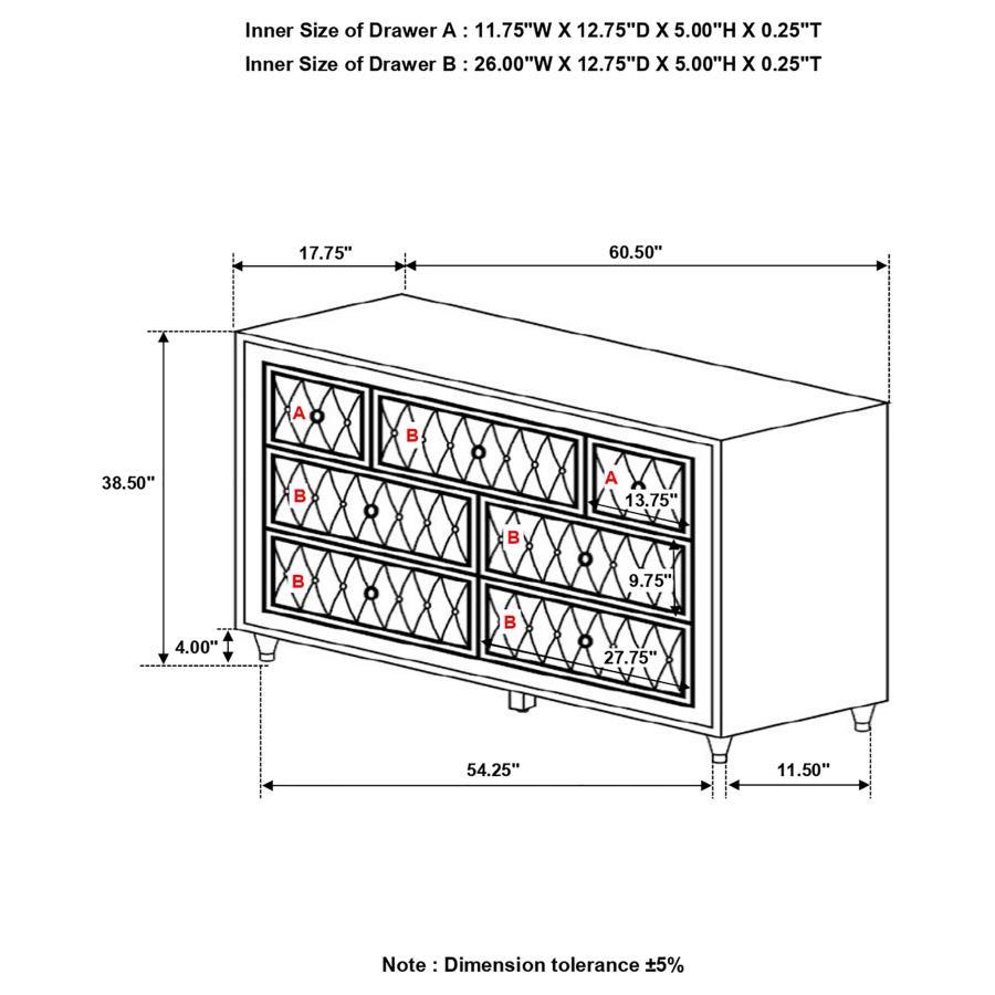Makeover your bedroom with this upholstered dresser. Bursting with French Provincial style, it's the perfect blend of traditional and modern. Seven spacious dressers are equipped for storing garments and clothing. Each dresser drawer is upholstered with soft fabric and button tufting. Crystal-like accents serve as buttons and drawer knobs and this piece is supported on tapered legs, injecting incredible style in your space.