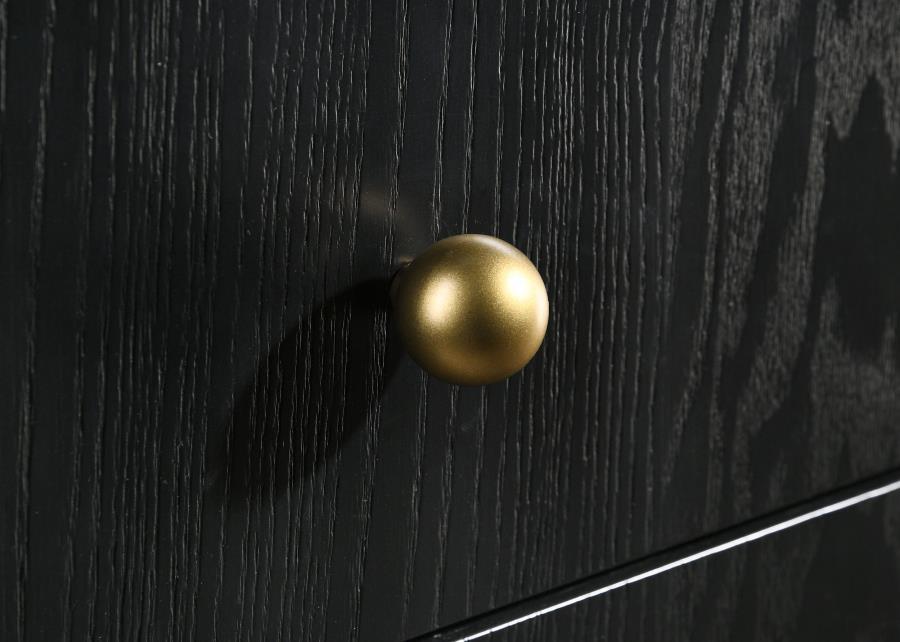 Put a fresh spin on your bedroom with the addition of a modern nightstand. Its three drawers provide plenty of storage at your bedside, great for books and personal items. The top drawer includes felt linking top protect important items, and a built-in USB port adds access for easily charging your phone overnight or while lounging in bed. The nightstand features a crisp black wire brushed finish that enhances its wood grain details, and gold finish ball knobs and legs add the perfect dose of contrasting warmth. Rounded corners soften the silhouette while a generous top is just right for a reading light or decor.