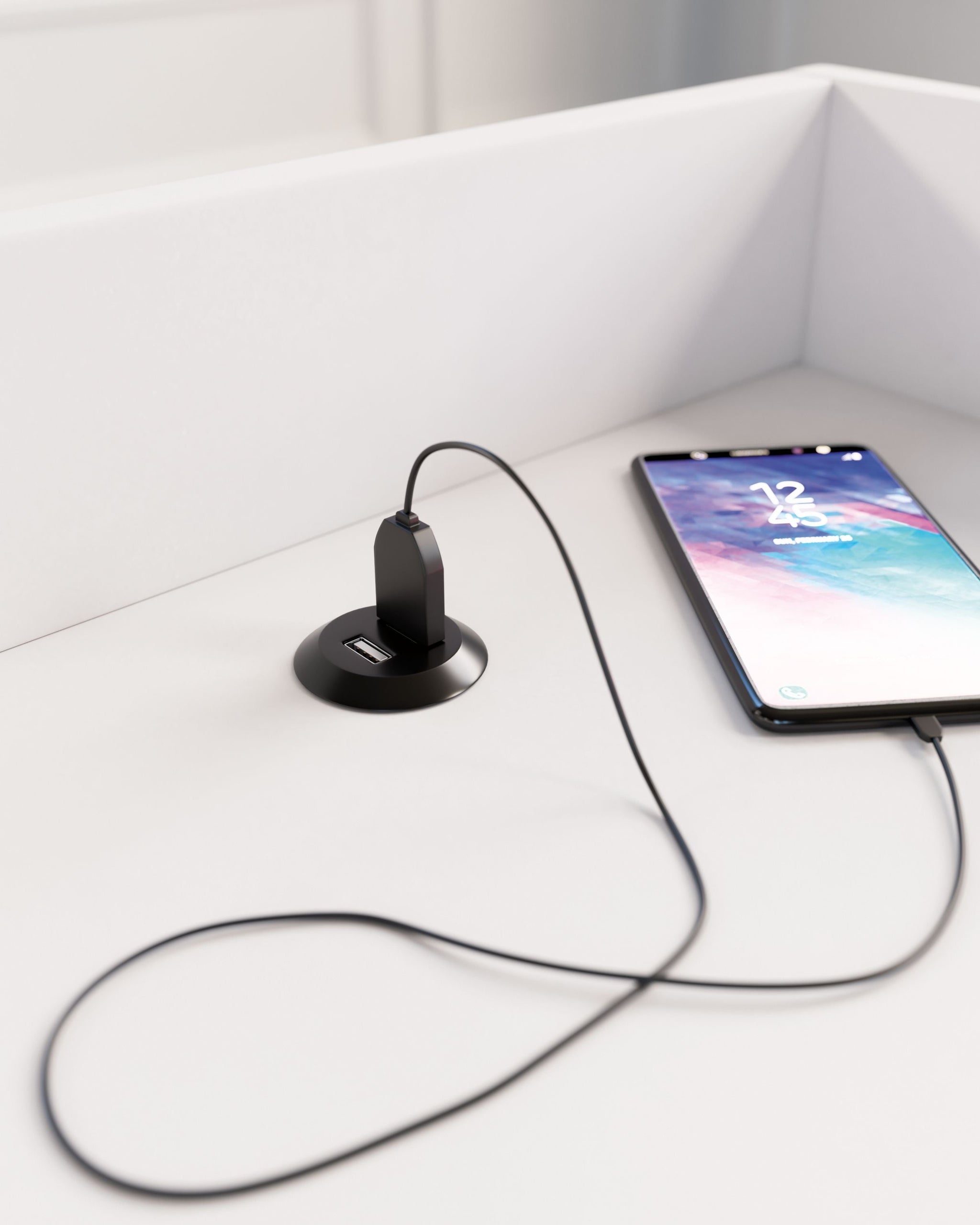 Display your decor with simple style on this accent table. Constructed of wood and engineered wood in a crisp, white finish, this table blends easily with your existing living room aesthetic or stands in as a kid's bedside table. A gallery rail top, undermount shelf and dual USB chargers keep your life (and your look) simply sensational.